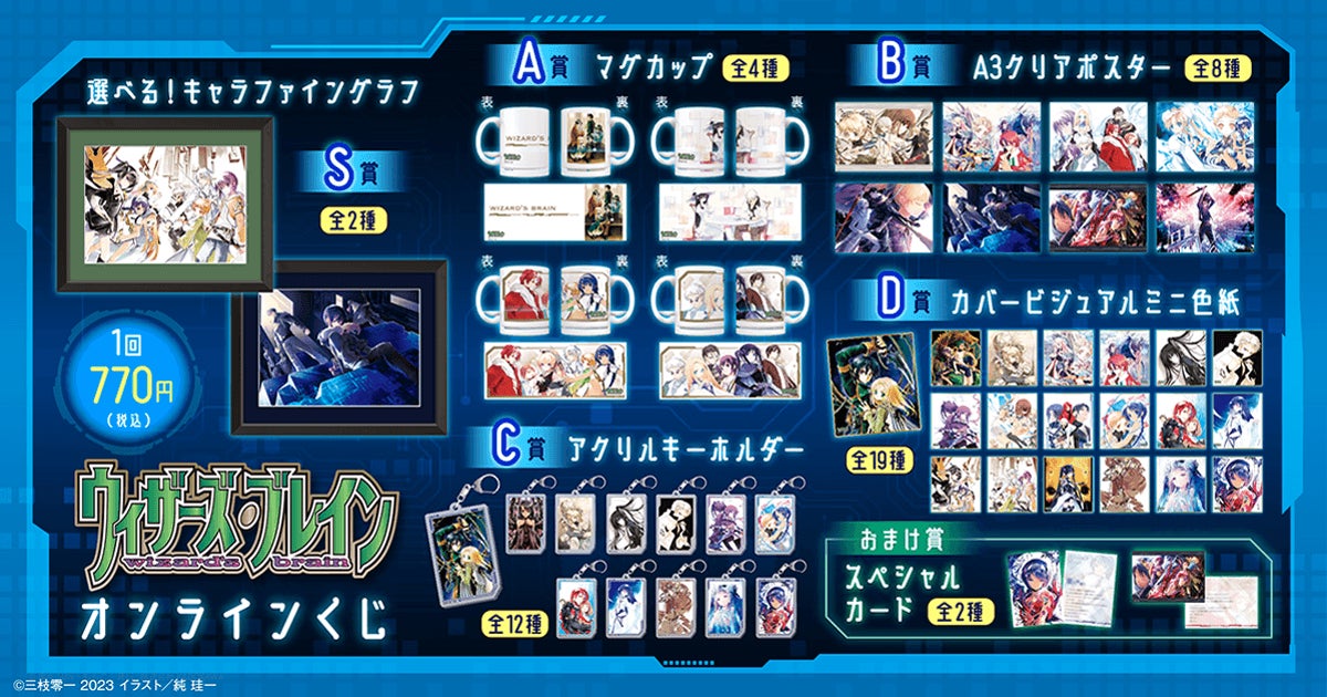 賞品は電撃文庫30周年と『ウィザーズ・ブレインIX 破滅の星〈下〉』の発売を記念して、原作イラストレーター・純珪一先生の貴重なイラストを使用したオリジナルグッズとなります! キャラファイングラフやマグカップなど、原作カバーイラストなどを使用したファン必携のアイテムをご用意しました。 また期間中に【10連セット】ご購入で、2023年5月に発売された電撃文庫の新刊『ウィザーズ・ブレインIX 破滅の星〈下〉』の後日談を描いた三枝零一先生書き下ろしの掌編が楽しめる『スペシャルカード』をプレゼントするキャンペーンも実施!! この機会をお見逃しなく。