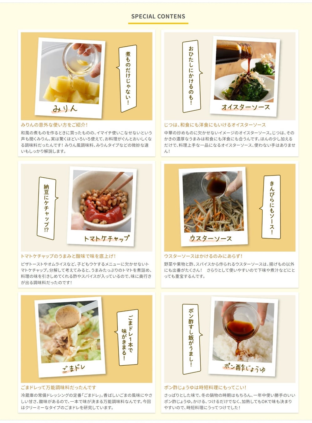 3月13日にオープンしたWEB特集「調味料ラボ」は、「せっかく購入したもののいつも決まりきった使い方しかできない」「なかなか使い切れない…」という主婦の方の声を受け、調味料に対しての魅力を再発見できる機会を、と誕生しました。