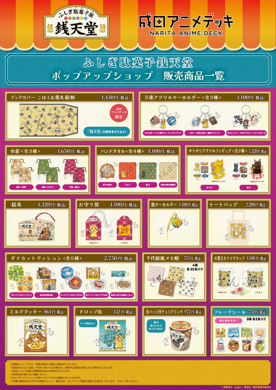 この会場でしか手に入らないポップアップショップ限定の「銭天堂」原作本が入るブックカバーを成田アニメデッキ版、ダ・ヴィンチストア&九州アニメデッキ版の2種類販売。その他、3連アクリルキーホルダー、ダイカットクッション、巾着、缶バッジ付チョコクランチなどの販売を行います。