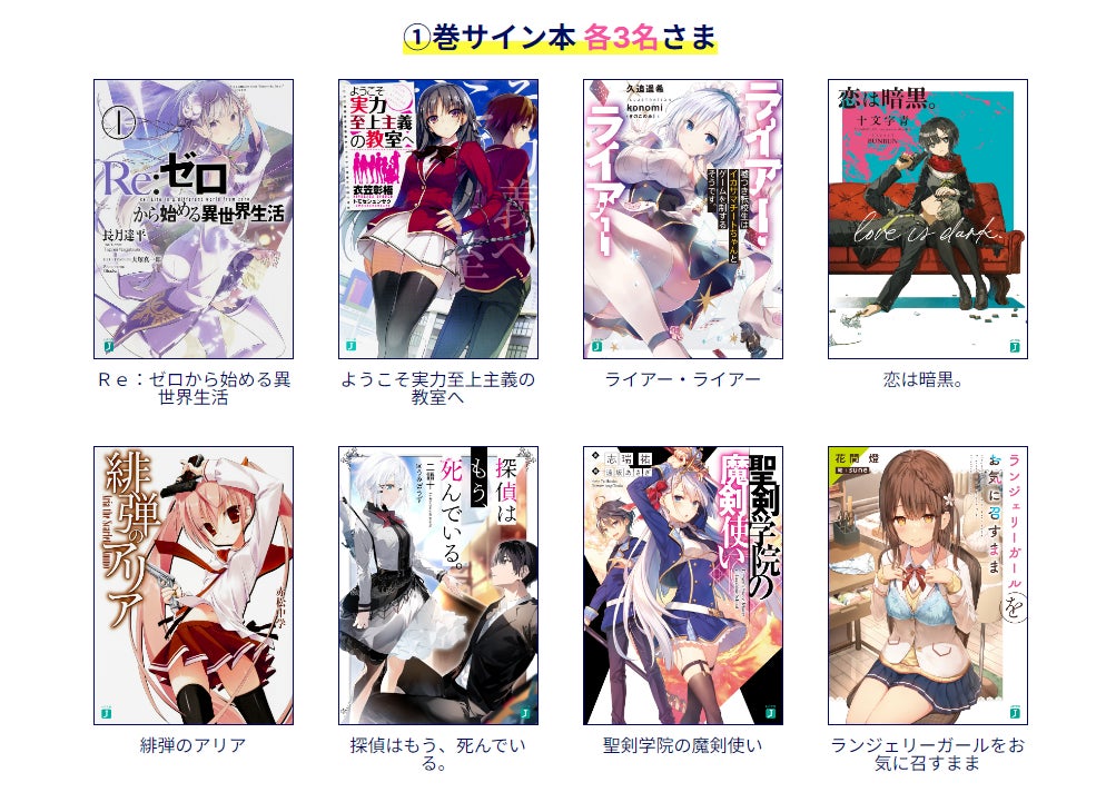 HJノベルス、HJ文庫、MFブックス、MF文庫J、Mノベルス、Mノベルスf、オーバーラップノベルス、オーバーラップノベルスf、オーバーラップ文庫、ガガガ文庫、角川スニーカー文庫、角川ビーンズ文庫、カドカワBOOKS、Kラノベブックス、Kラノベブックスf、講談社ラノベ文庫、サーガフォレスト、GAノベル、GA文庫、ダッシュエックス文庫、TOブックス、電撃の新文芸、電撃文庫、ドラゴンノベルス、DREノベルス、ノベルゼロ、ビーズログ文庫、ビーズログ文庫アリス、ファミ通文庫、ファンタジア文庫、ブレイブ文庫、モンスター文庫(五十音順)