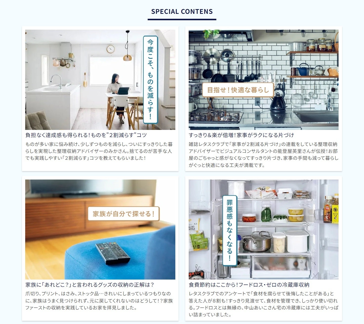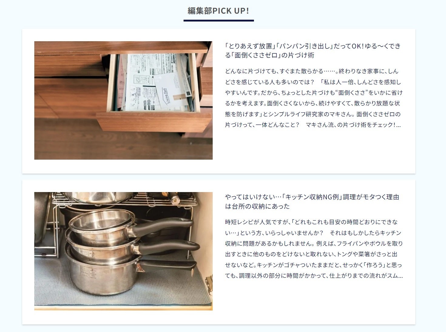 「キッチン収納NG集」「年末までにものを2割減らす」など、リアルに散らかったBeforeから、すっきり片づいたAfterになるまでを追う記事や、プロ愛用の収納グッズの情報が人気。今後もインフルエンサーを起用した記事などを続々配信する予定です。