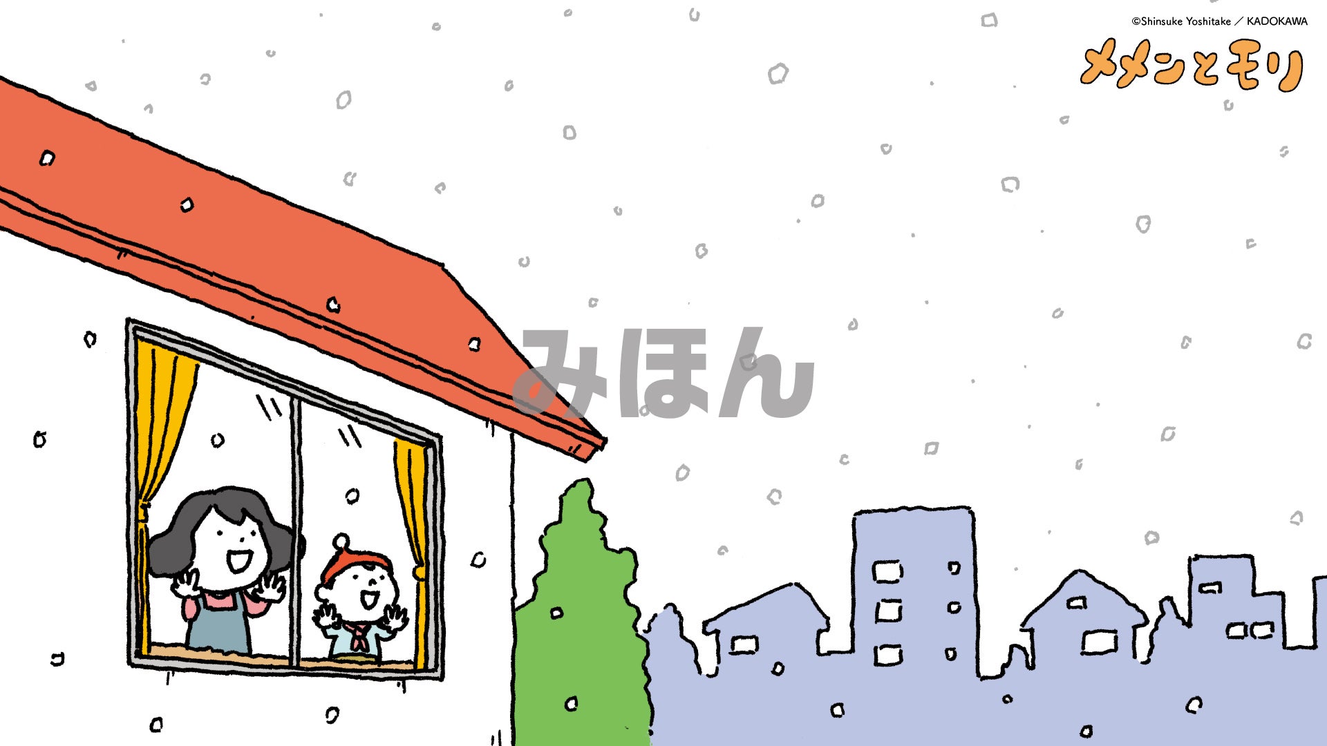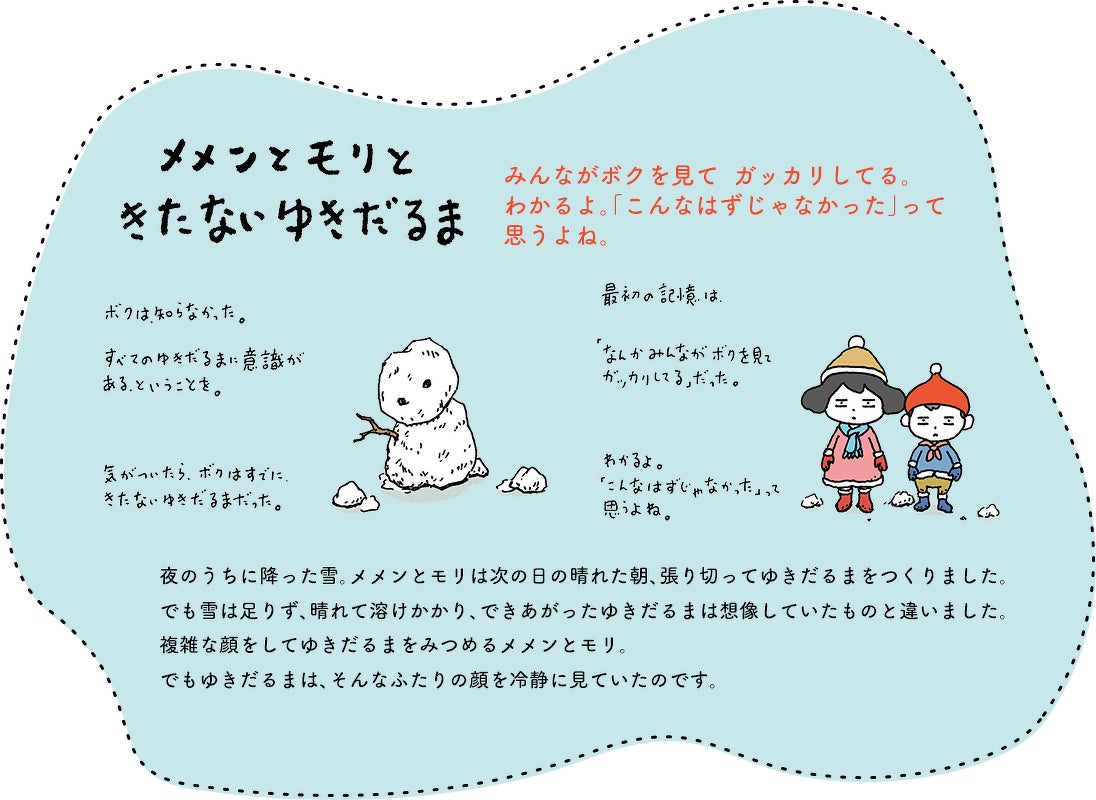 夜のうちに降った雪。メメンとモリは次の日の晴れた朝、張り切ってゆきだるまをつくりました。でも雪は足りず、晴れて溶けかかり、できあがったゆきだるまは想像していたものと違いました。複雑な顔をしてゆきだるまをみつめるメメンとモリ。でもゆきだるまには意識があり、そんなふたりの顔を冷静に見ていたのです。