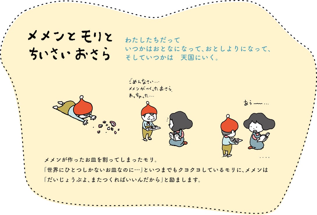 メメンが作ったお皿を割ってしまったモリ。「世界にひとつしかないお皿なのに...」といつまでもクヨクヨしているモリに、メメンは「だいじょうぶよ、またつくればいいんだから」と励まします。