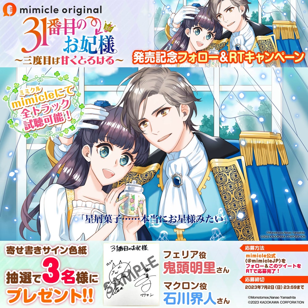 『31番目のお妃様 ~三度目は甘くとろける~』の発売を記念してフォロー&RTキャンペーンを開催。キャンペーン期間中にmimicle公式(@mimicleJP)をフォローしたうえでキャンペーンツイートをリツイートすれば応募完了となります。抽選で3名様に「鬼頭明里さん&石川界人さんの直筆サイン色紙」をプレゼントいたします。