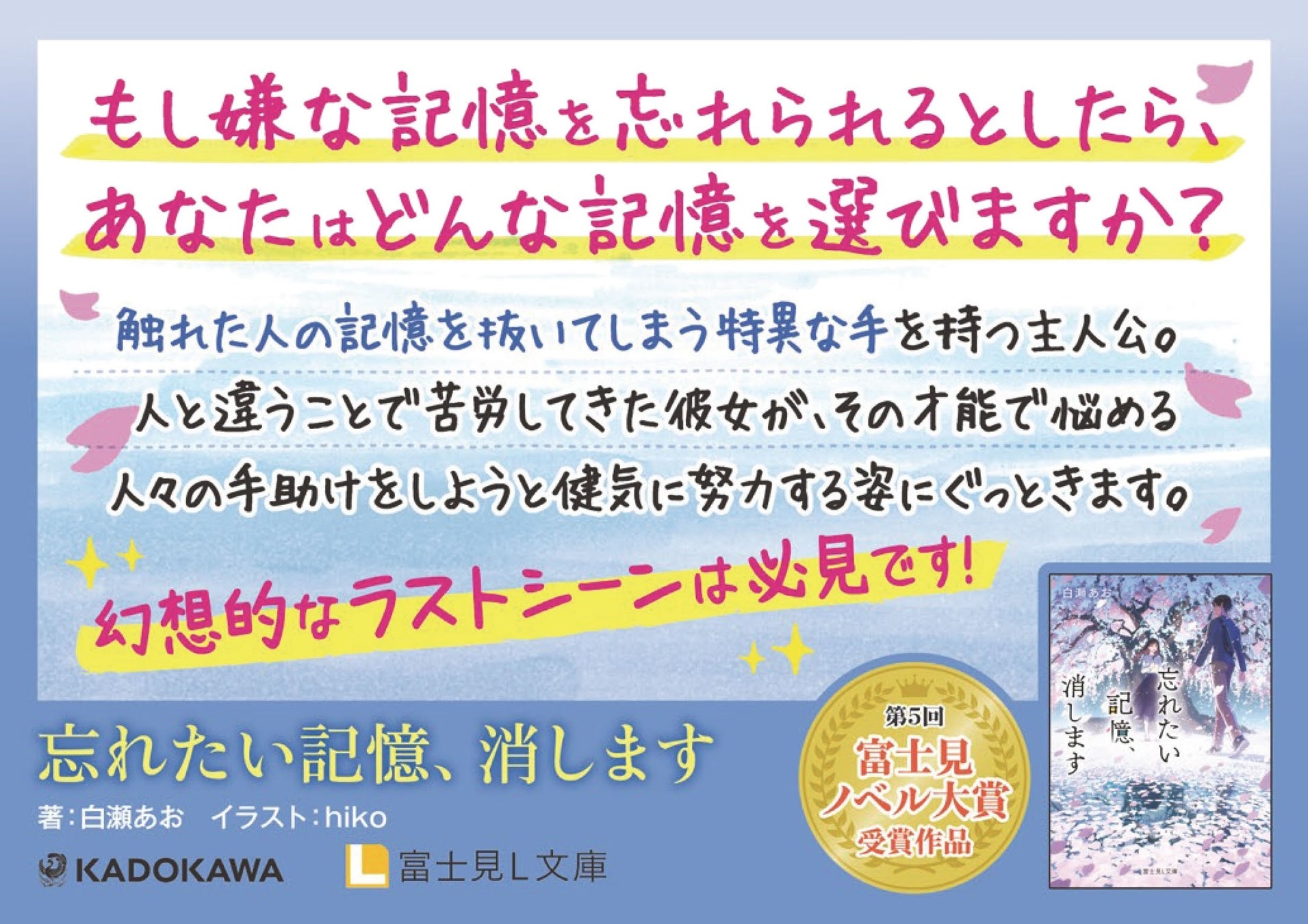 第5回富士見ノベル大賞の受賞作『忘れたい記憶、消します』『下町九十九心縁帖』の2作品が、本日6月15日(木)に富士見L文庫より発売となりました。