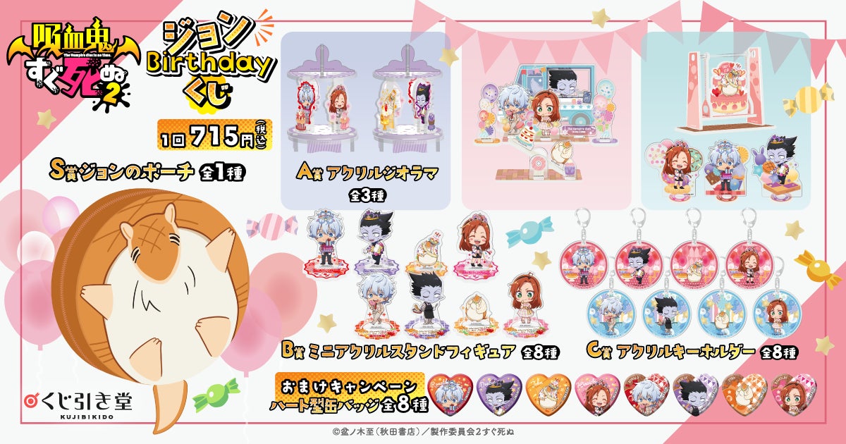 <「吸血鬼すぐ死ぬ2」 ジョン Birthday くじ! 概要> 販売期間:2023年7月1日(土)12:00~2023年7月27日(木)11:59 販売価格:1回 715円(税込)※別途発送手数料が掛かります。 |