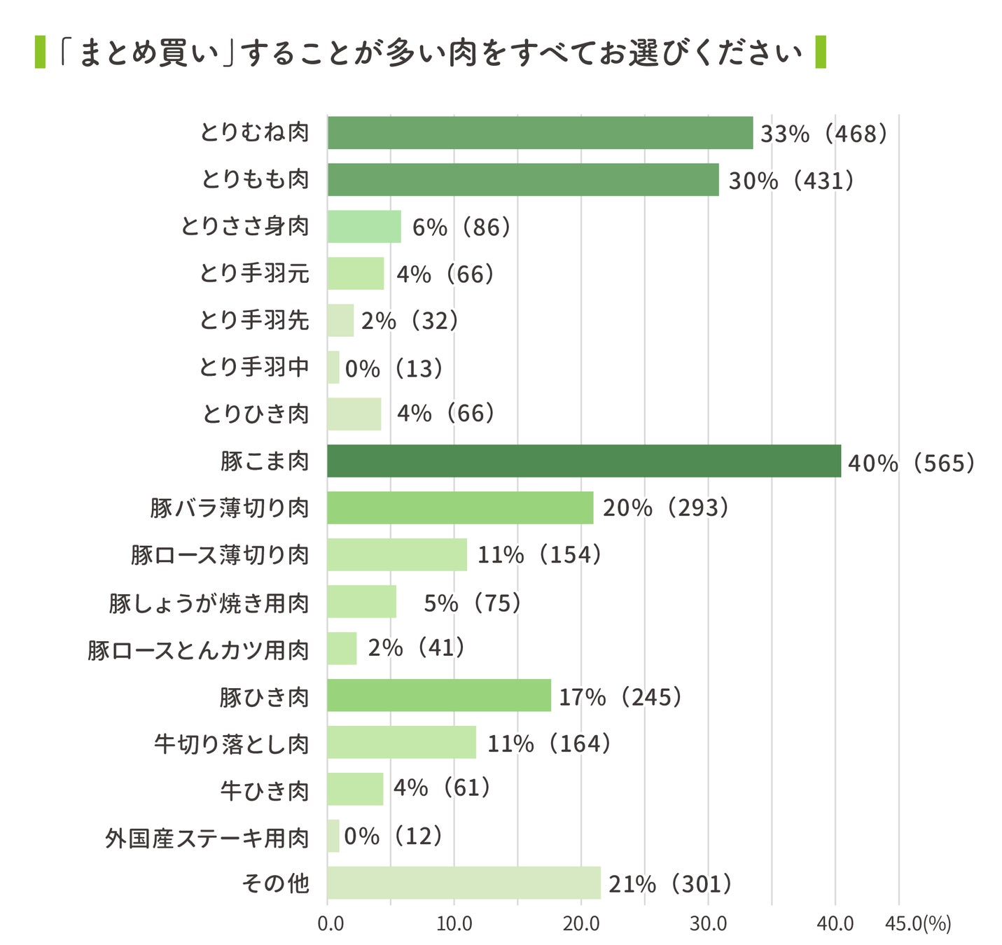「豚こま肉(40%)」「とりむね肉(33%)」「とりもも肉(30%)」が「まとめ買い」人気上位のコスパ肉。