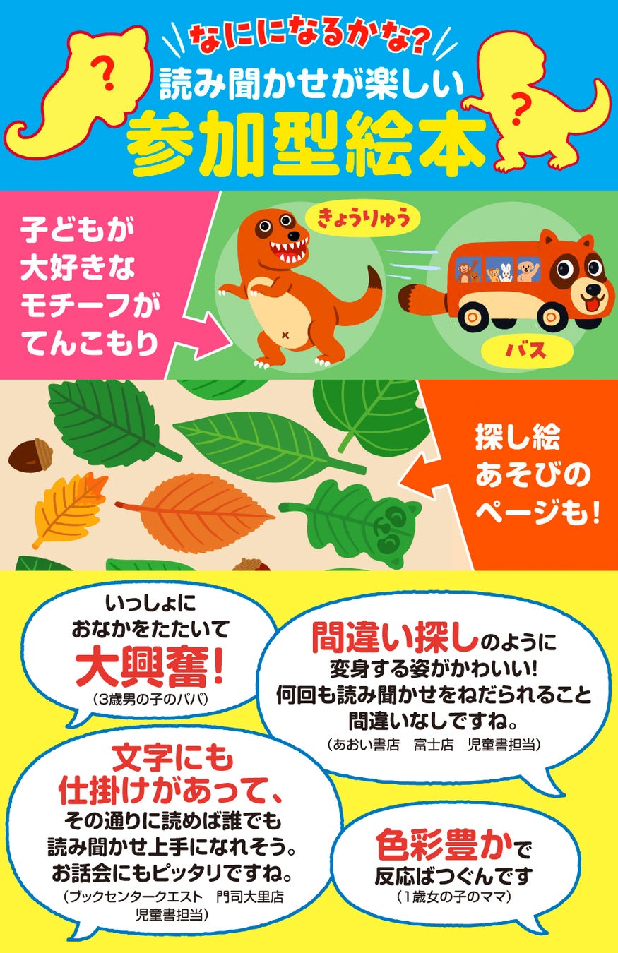 変身が得意なたぬきさんが、きょうりゅう、バスなど、子どもに人気のモチーフにどんどん変身!