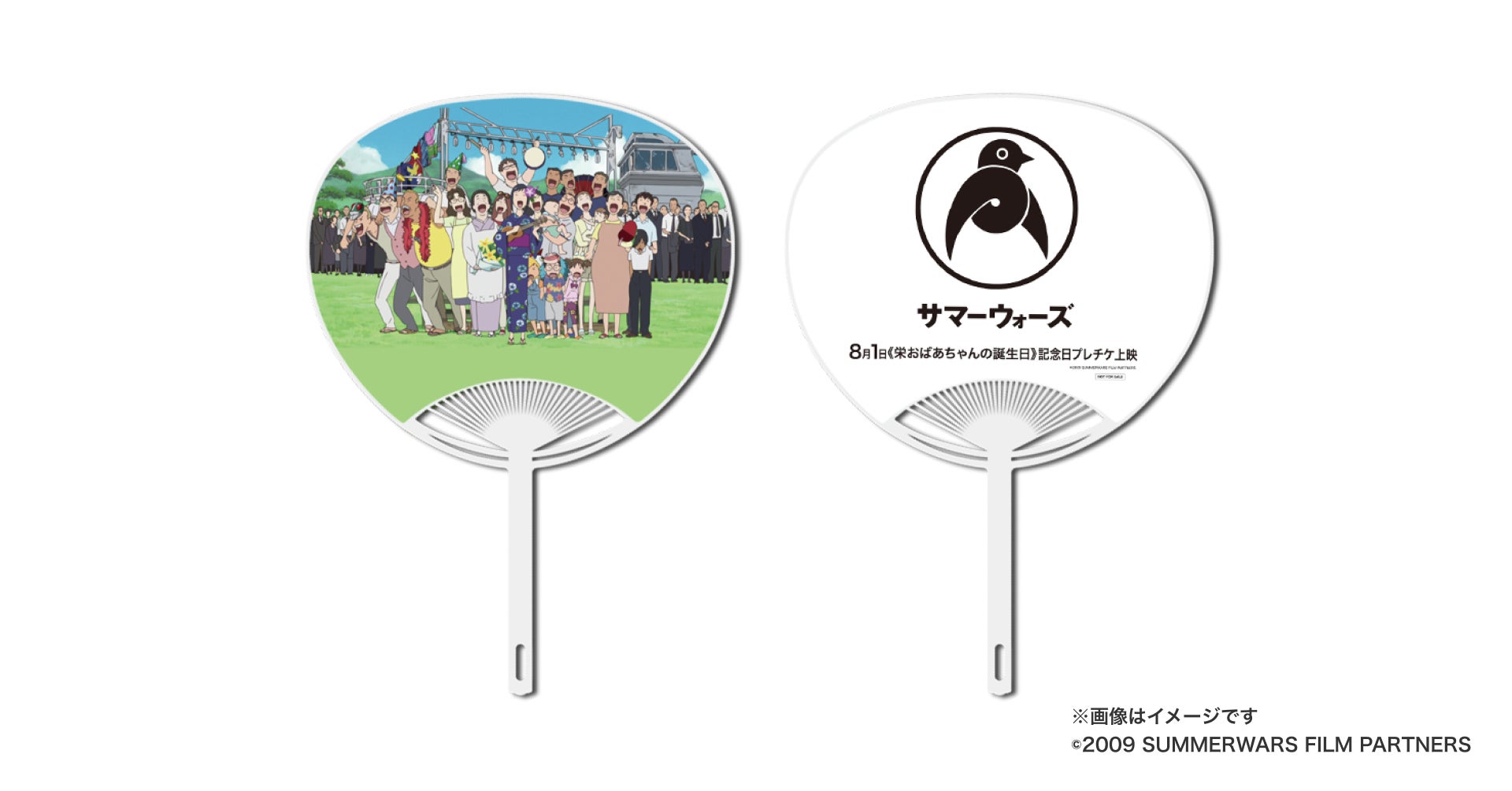 8月1日の栄おばあちゃんの誕生日にご来場いただいた方に、『サマーウォーズ』の陣内家の家紋入りのオリジナルうちわを数量限定で配布いたします。
