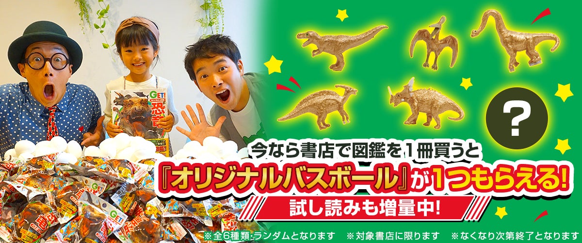 キャンペーン参加店舗にて『角川の集める図鑑GET!』シリーズのうちどれか1冊を買うと、金ぴかにかがやく恐竜フィギュアが入ったオリジナルバスボールが1個もらえます。フィギュアは全部で6種類。そのうち1つはシークレットです。ぜひたくさん集めてください!