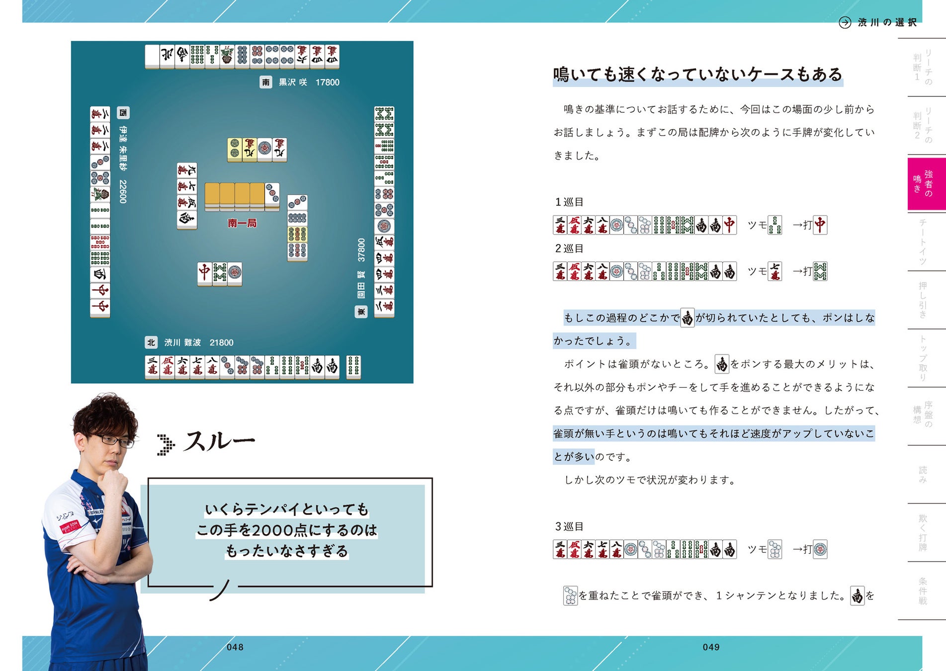 この本ではそんな渋川と意見が割れる場面についてたくさん討論しましたが、勝ち続けてる二人の間で意見が割れるというのは「麻雀というゲームの自由さ」を表していると思います。麻雀の勉強というと「これはこうしなくちゃいけない」「あれはやっちゃダメ」という思考になる人が多いですが、「こうしなくちゃいけない」も「やっちゃダメ」も麻雀にはありません。むしろそういった決めつけが強くなることを阻むこともあります。この本を通して柔軟な麻雀脳を身につけて欲しいですね。