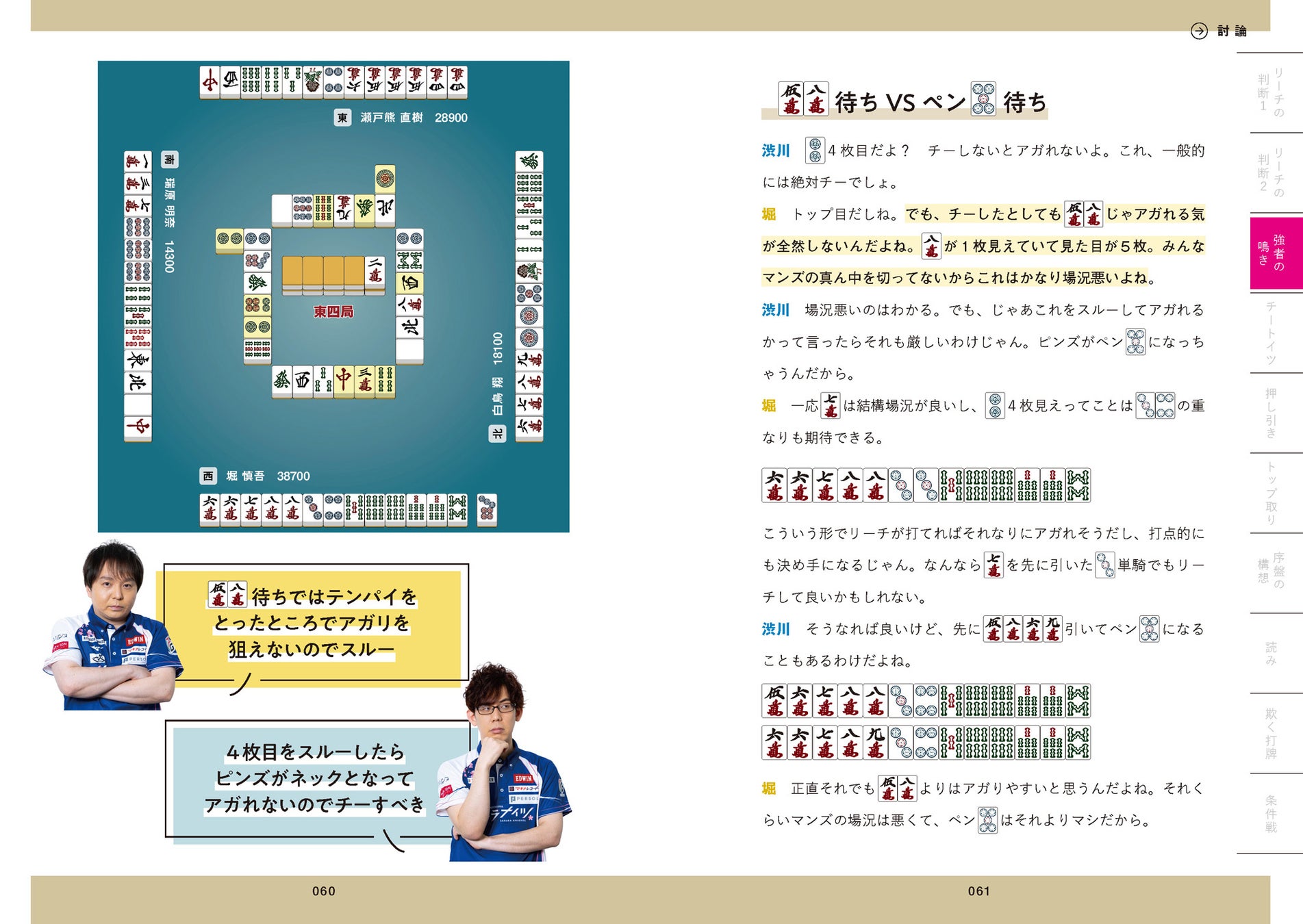 討論になった場面は、正直僕らにも本当の正解はわかりません。けれど麻雀というゲームは、強者同士で意見が割れている場面というのはさほど成績に影響しないものです。討論部分は読み物として楽しんでいただきつつ、麻雀の勉強をしたい人は個別の解説ページを参考にしてもらえると、一冊で2つの楽しみ方ができると思います。
