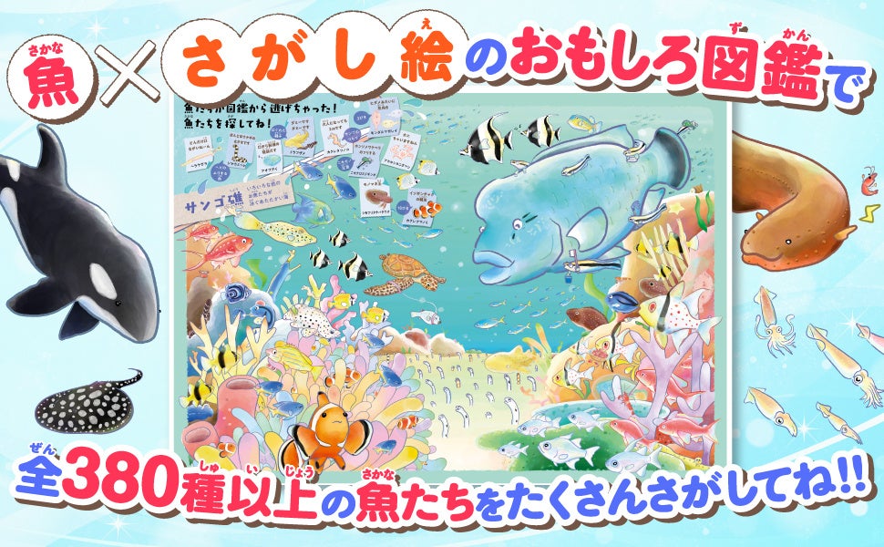 本書は、魚や水の生きもののことを楽しく教えてくれる「さかなのおにいさん かわちゃん」による魚の探し絵図鑑絵本です。太平洋、深海、極海、日本の川、太古の海、回転寿司屋さん……などさまざまな場所に逃げてしまった380種以上の魚や水の生きものたちを、探して見つけて遊ぶ一冊となっています。