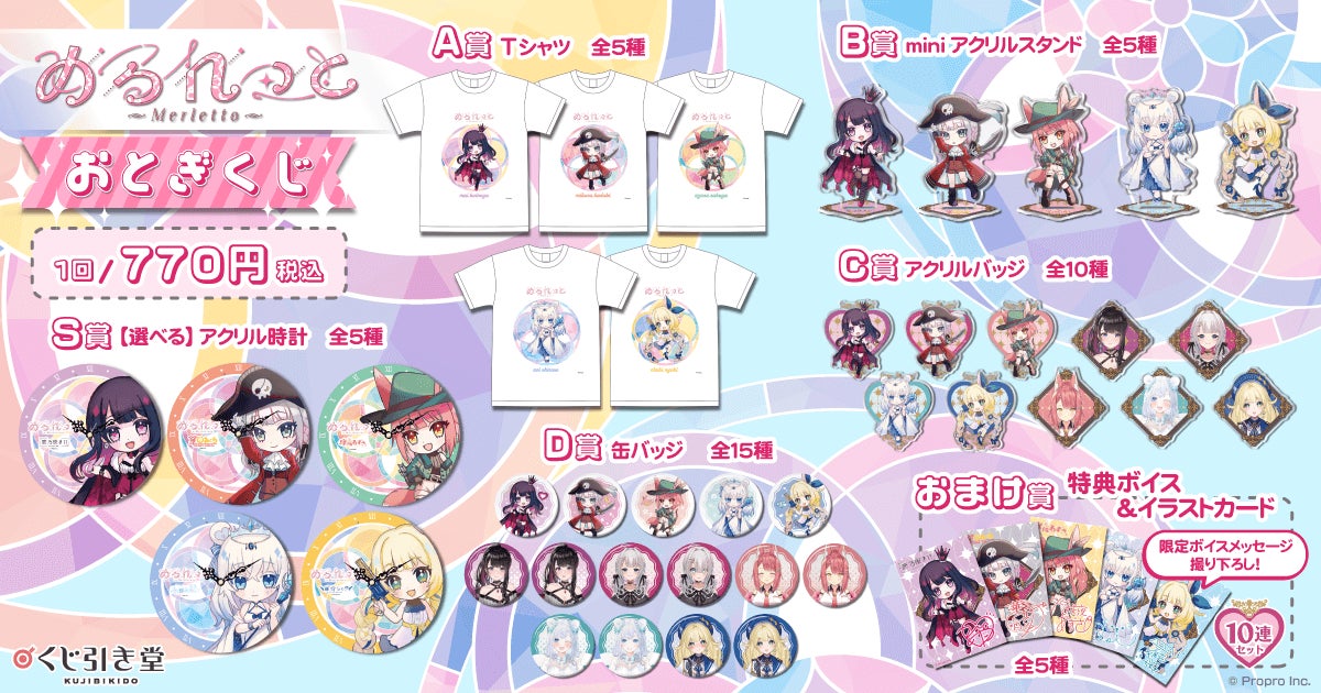 商品は『めるれっと』のメンバー・恋乃夜まい、華月みくる、咲夜あずさ、白瀬あおい、猟奇ちゃきの新規イラストによるオリジナルグッズとなります。メンバーがおとぎ話をイメージした衣装に身を包んだ姿を描いた限定イラストの商品など、オリジナルグッズを多数展開しております。