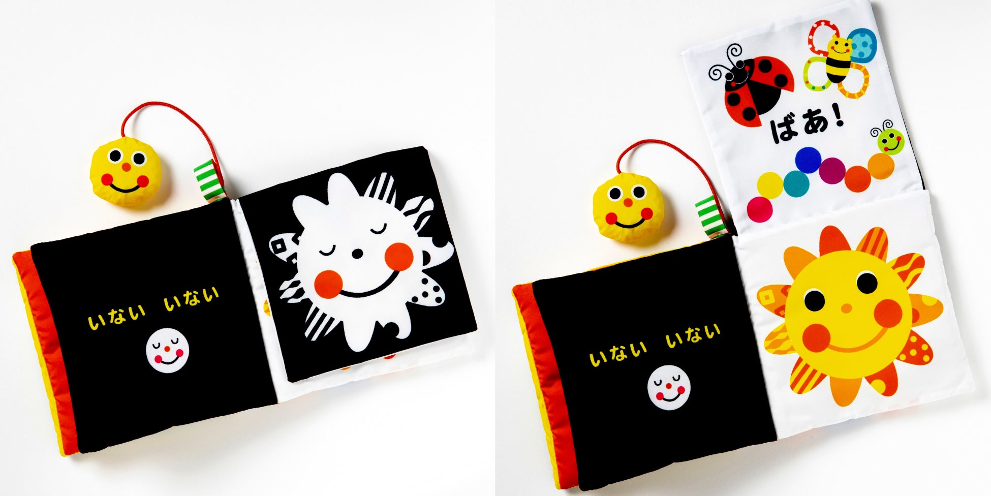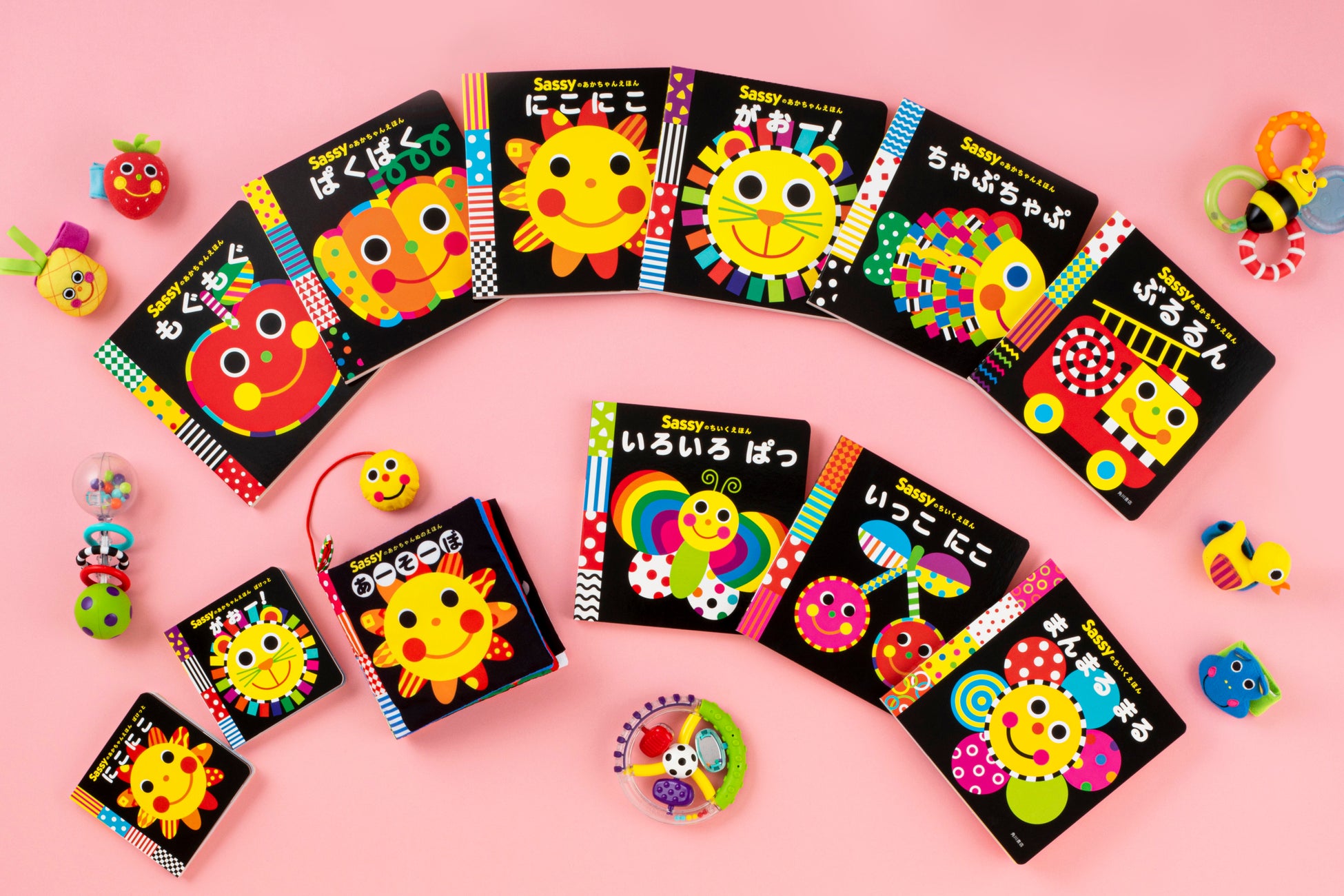 発達心理学研究に基づいた「左右対称のにこにこ顔」「規則正しい模様」「強いコントラストの配色」をちりばめ、赤ちゃんをくぎづけにする「Sassyのえほん」シリーズ。