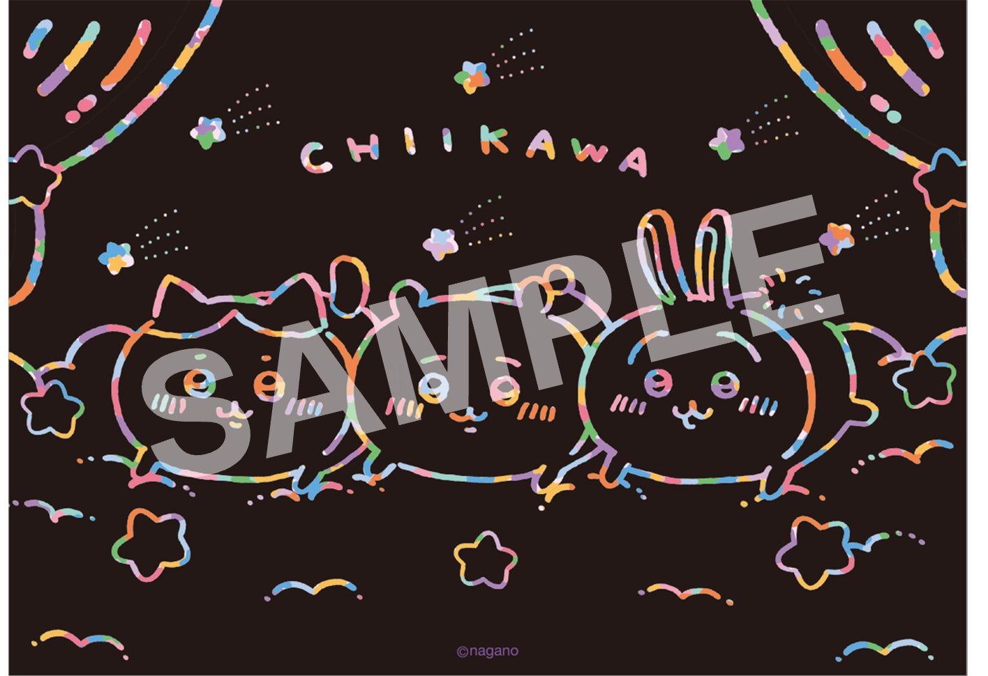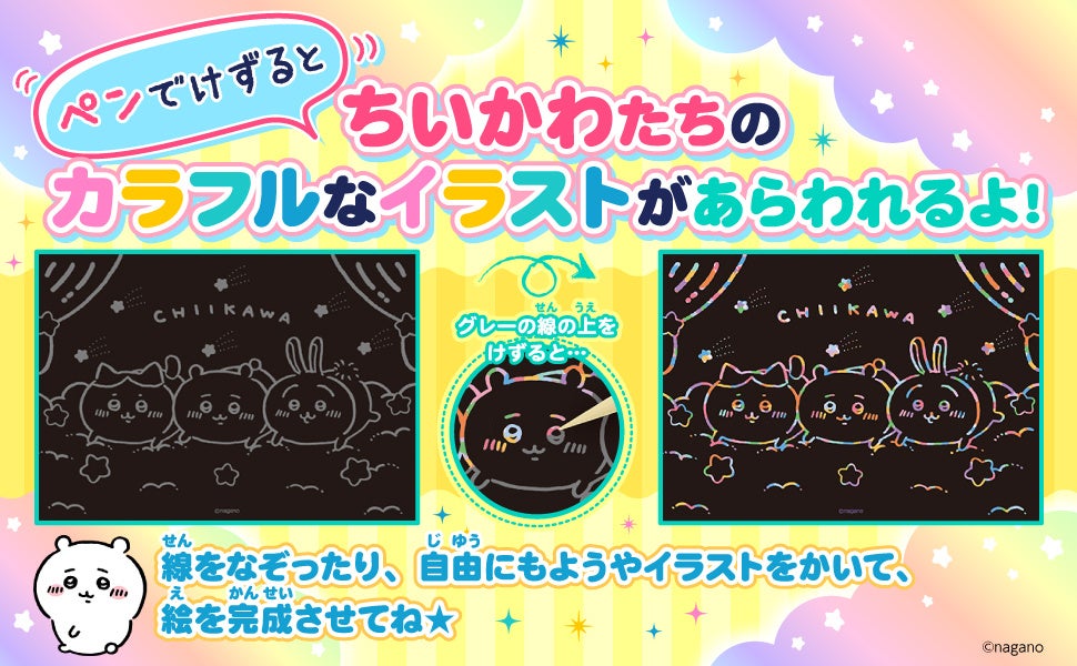 付属のペンでシートの上の線をなぞったり、絵をぬるようにけずったりすると、ちいかわたちのカラフルなイラストが浮かびあがります。
