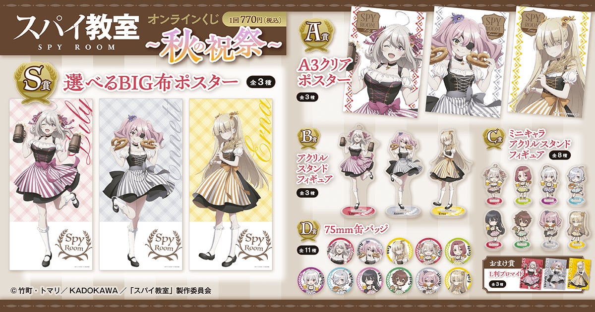 <スパイ教室 オンラインくじ ~秋の祝祭~ 概要> 販売期間:2023年9月12日(火)12:00~2023年10月3日(火)11:59 販売価格:1回 770円(税込)※別途発送手数料が掛かります。  |