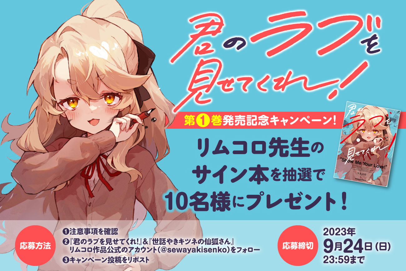 X(Twitter)プレゼントキャンペーンの詳細は、『君のラブを見せてくれ!』&『世話やきキツネの仙狐さん』リムコロ作品公式X(Twitter)アカウント、またはキャンペーンツイートをご確認ください。