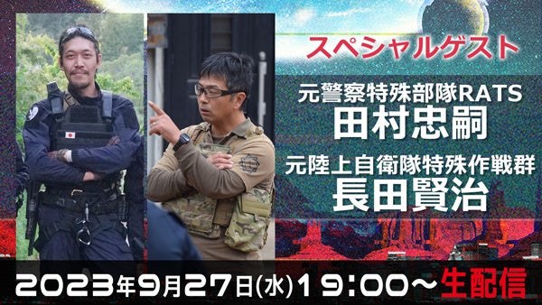 9月27日の生放送は、「護身術」「ホームセキュリティー」「災害対策」等の私生活に役立つ情報から、「面白企画」を配信中のYouTubeチャンネル「ガチタマTV」から、元警察特殊部隊RATSの田村忠嗣さん、元陸上自衛隊特殊作戦群の長田賢治さんをゲストにお迎えします。