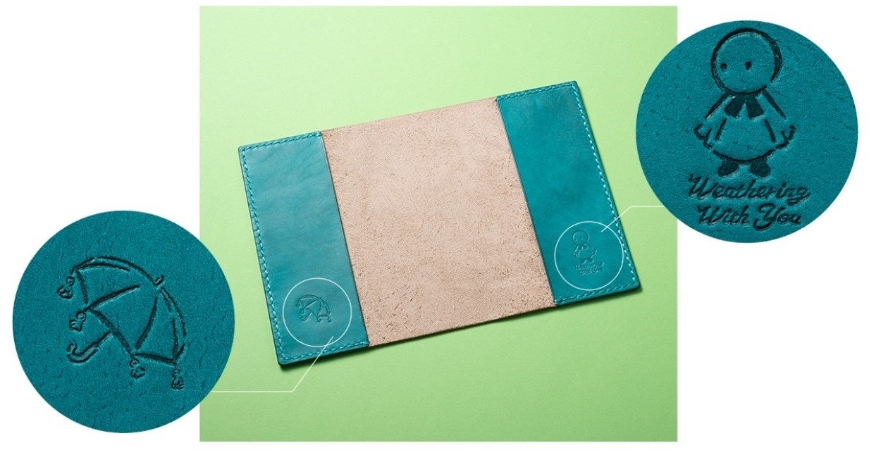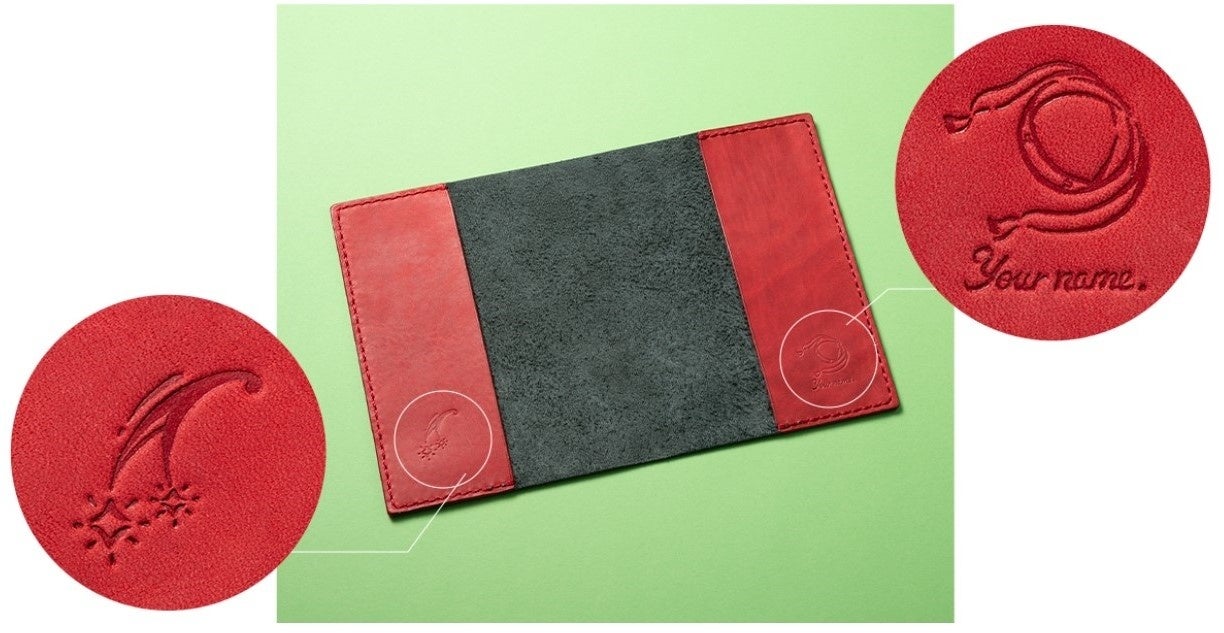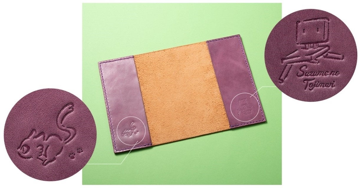 革は、使えば使うほど手になじむ柔らかな牛革を使用。外側と内側の革、ステッチ糸の色はそれぞれの作品のイメージカラーで組み合わせ、内側には左右にオリジナルイラストを刻印しています。