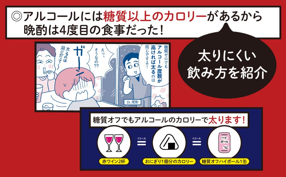 そこで本書では「家飲みなら」「飲み会なら」と、シーンごとのスマートな減酒のコツを、マンガと図版で解説。見るだけでわかるページ構成で紹介しています。