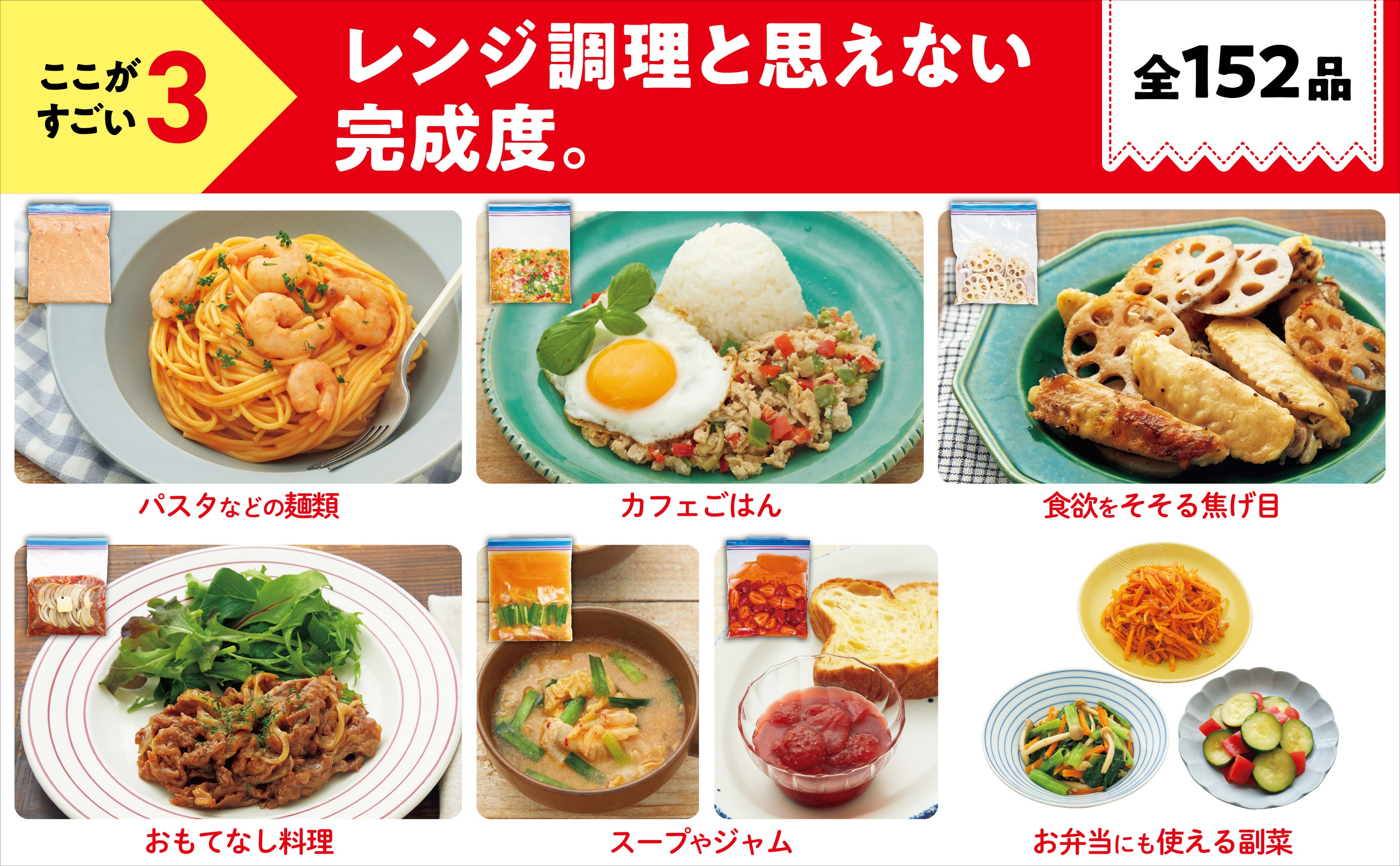 パスタなどの麺類、おもてなし料理、カフェごはんなど、手が込んだように見える料理が全152品。