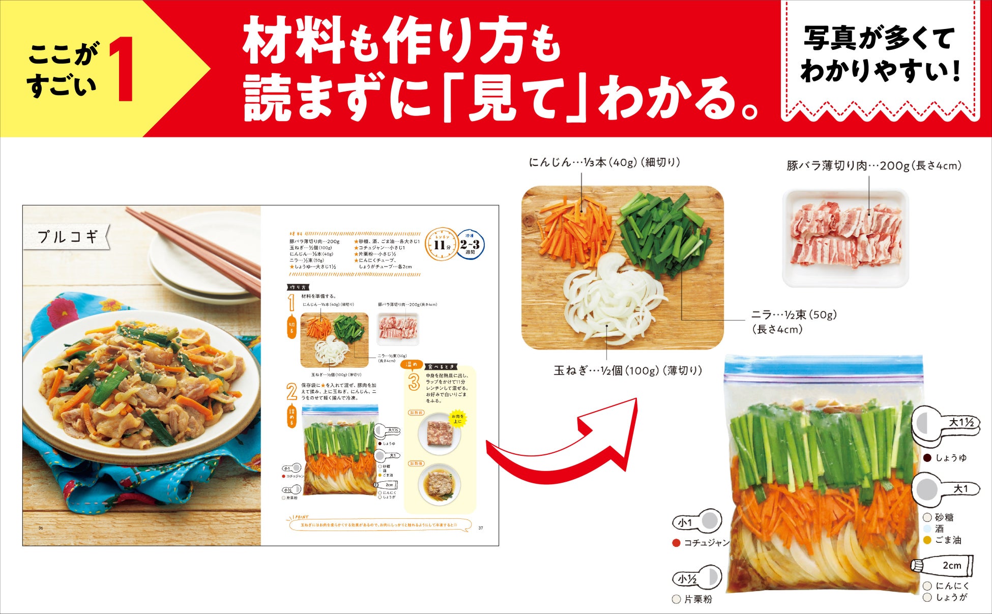 本書では、食材や調味料の量が「見て」わかります。