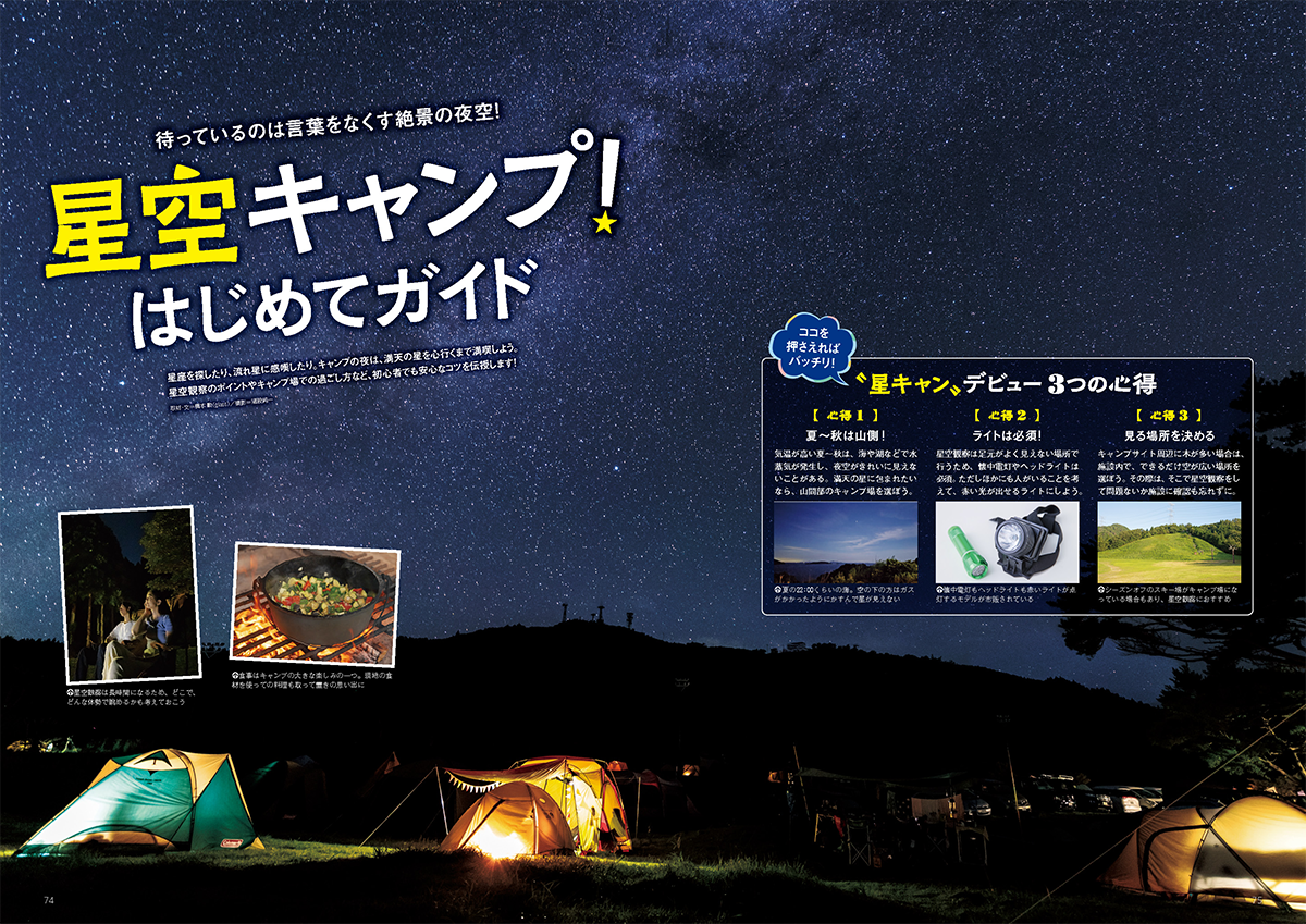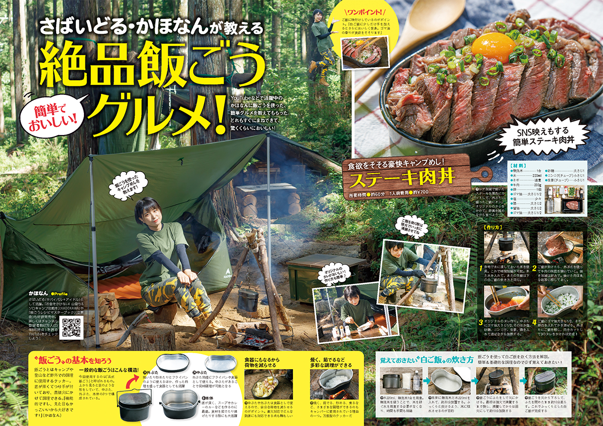 YouTubeなどで活躍中のかほなんさんが教える「絶品飯ごうグルメ」や一生の思い出になる「星空キャンプ」、ファミリー・ソロ・女子など「スタイル別 完全プラン」なども掲載。