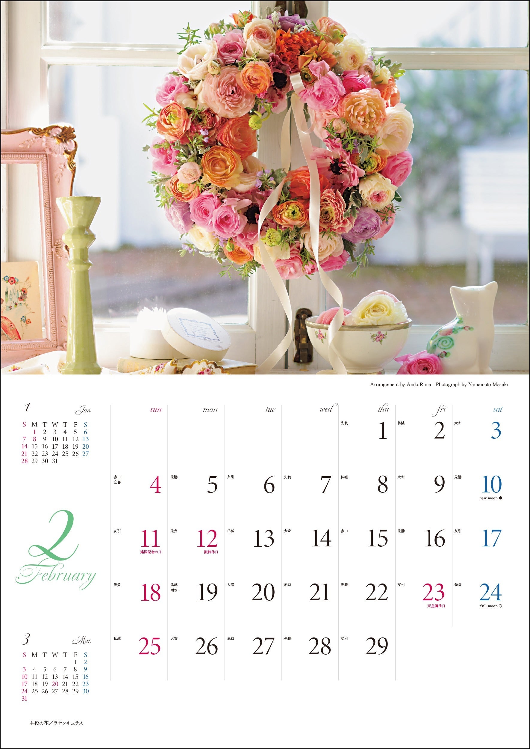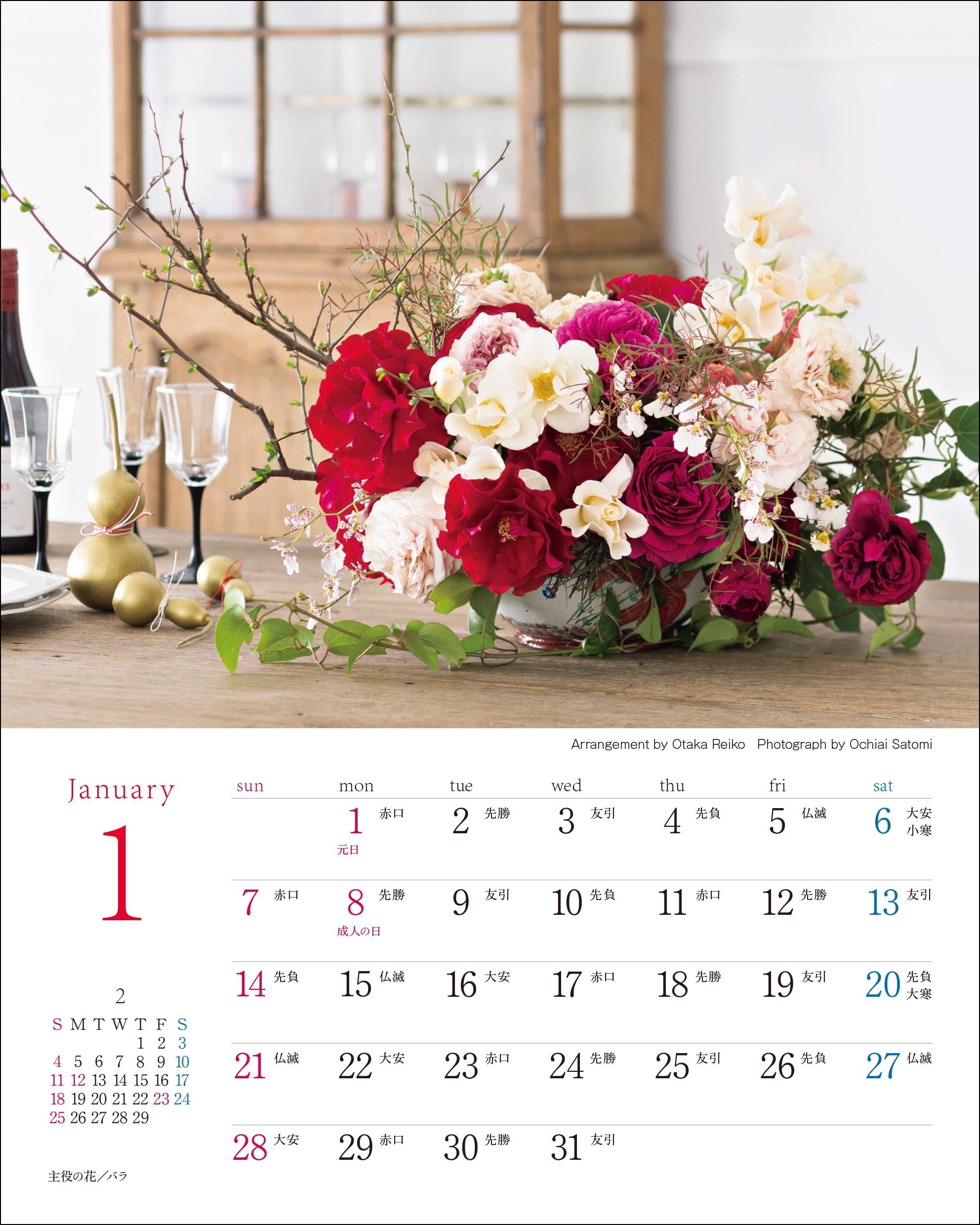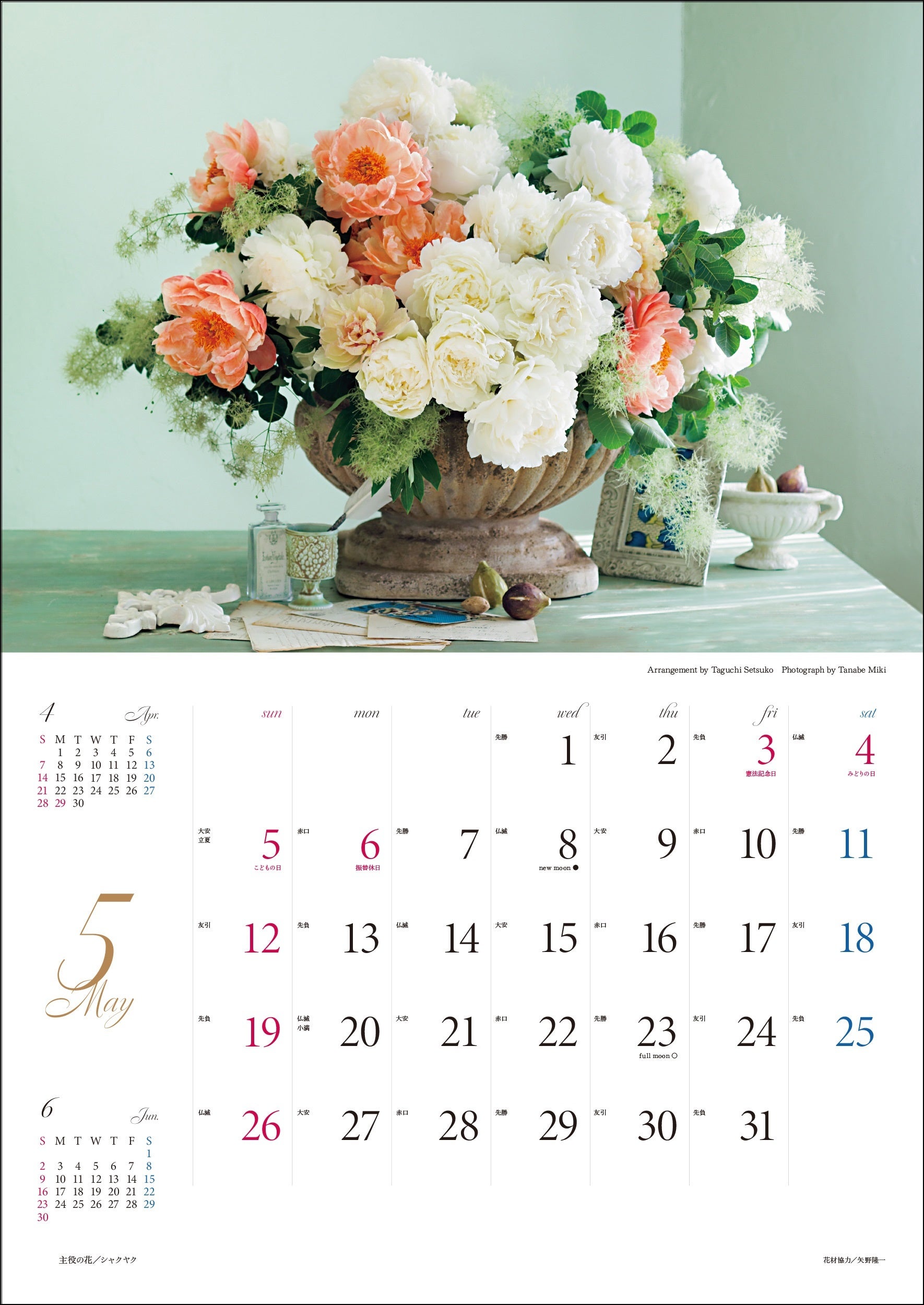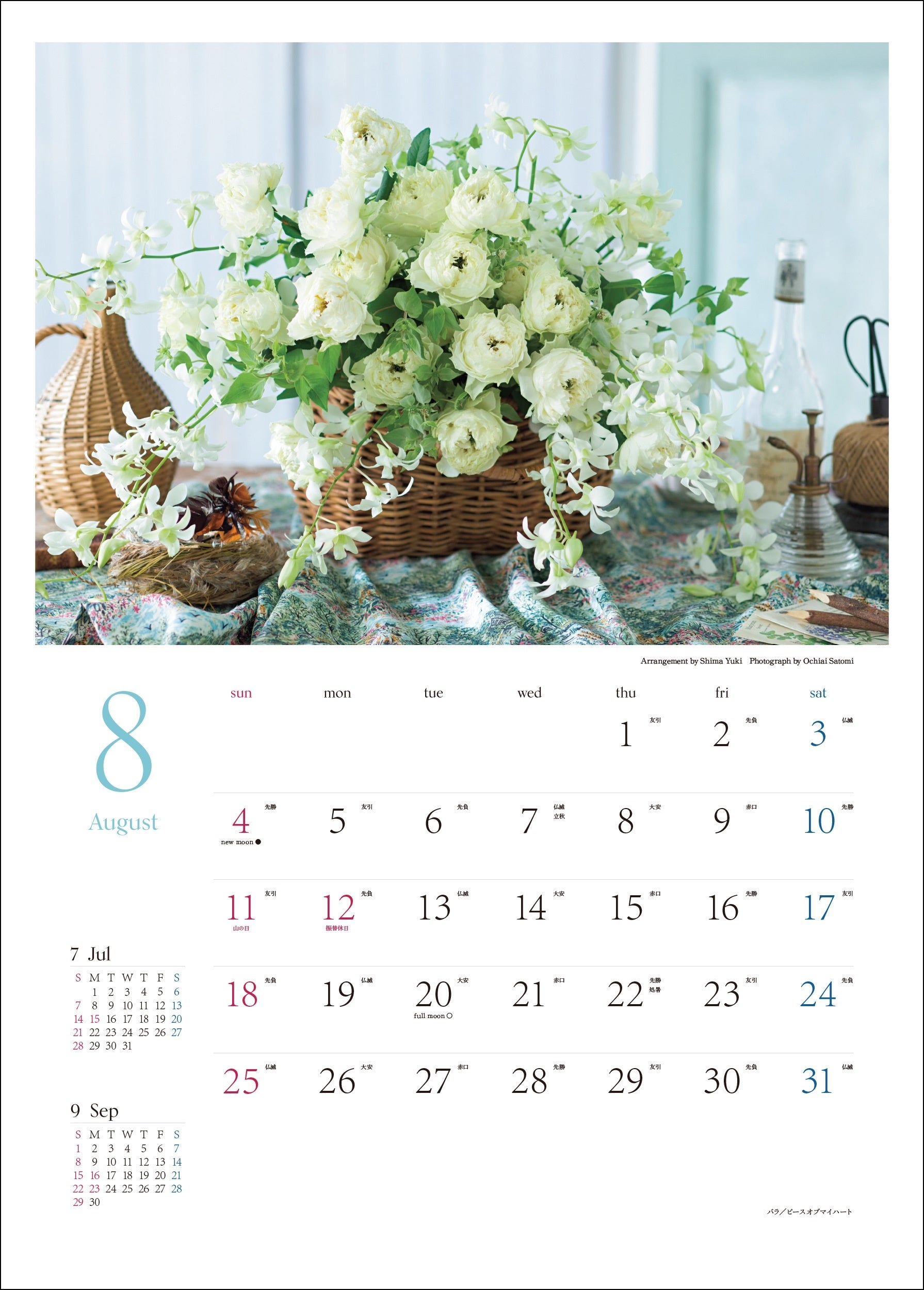 コチョウラン、ラナンキュラス、ミモザ、サクラ、シャクヤク、アジサイ、ユリ、ヒマワリ……と、その月にもっとも美しい花のアレンジで、季節を綴ります。ビジュアルはもちろん、機能も充実したカレンダーです。