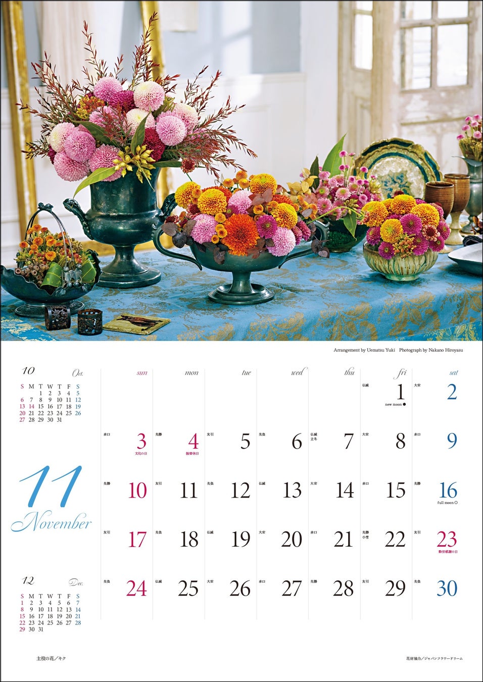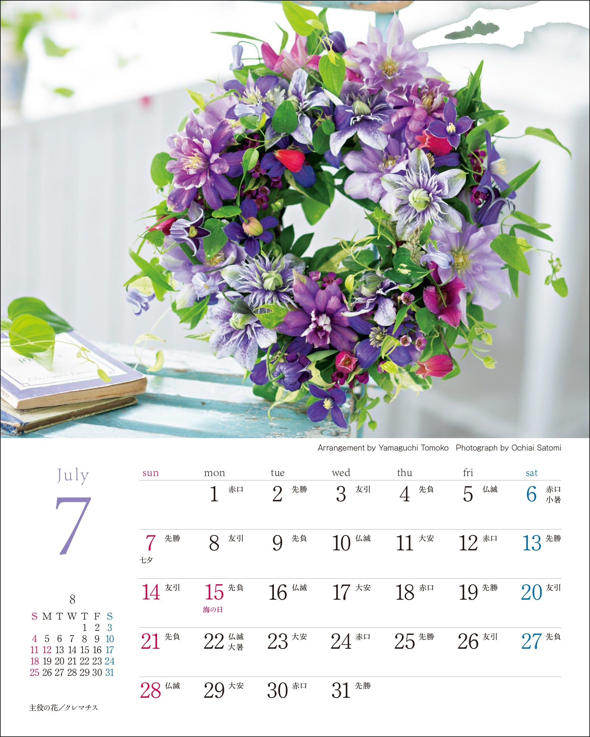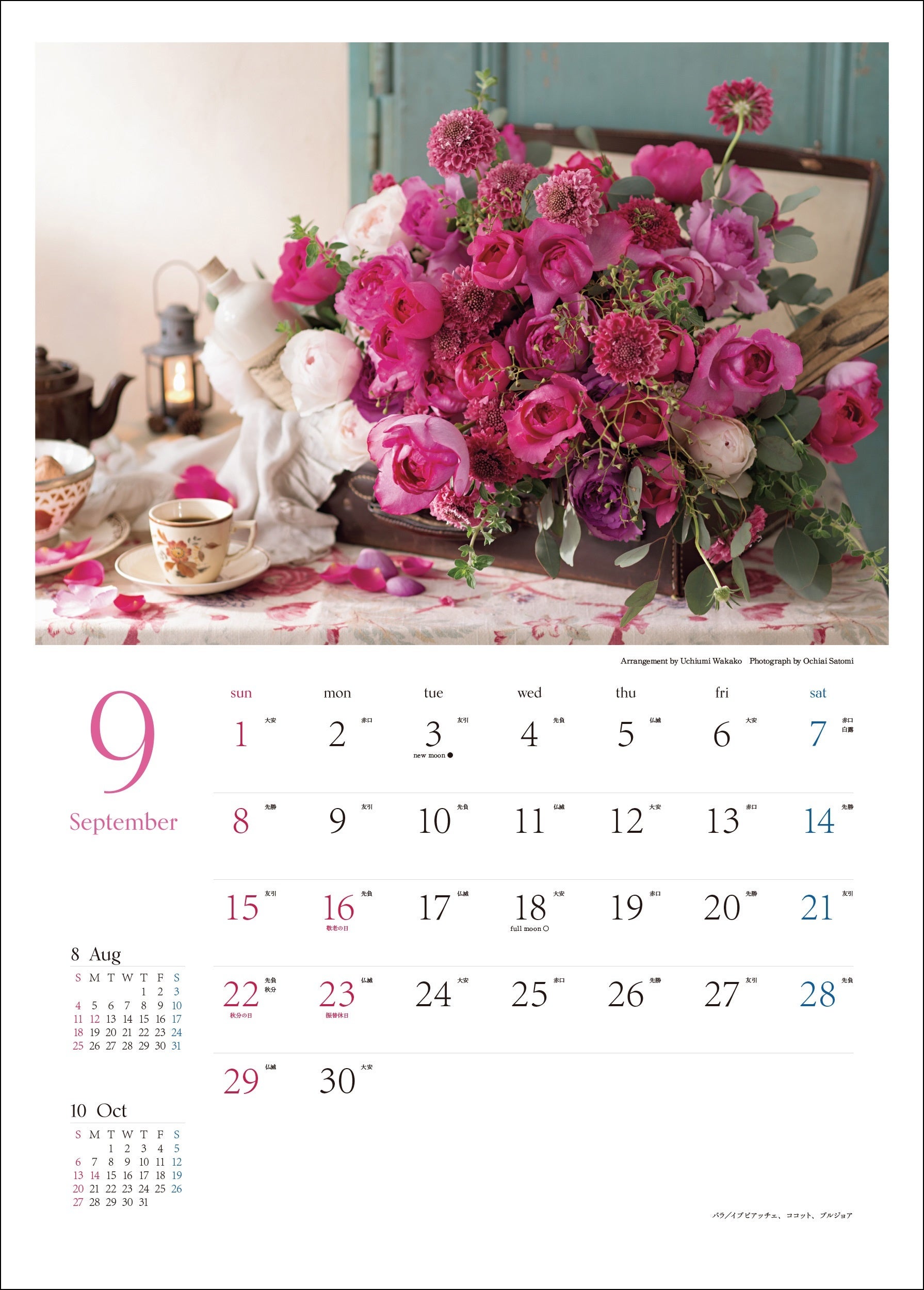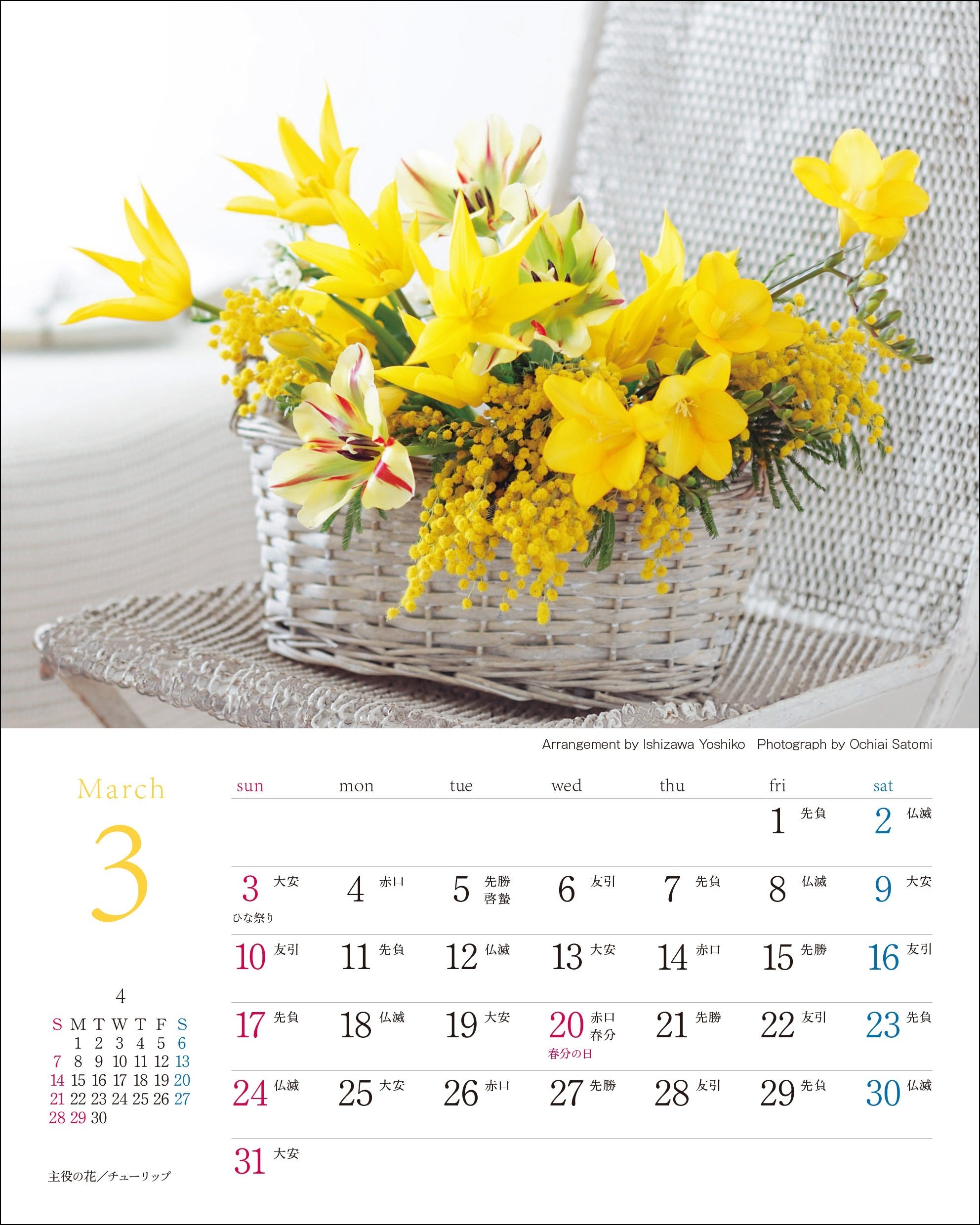 コチョウラン、ラナンキュラス、ミモザ、サクラ、シャクヤク、アジサイ、ユリ、ヒマワリ……と、その月にもっとも美しい花のアレンジで、季節を綴ります。ビジュアルはもちろん、機能も充実したカレンダーです。