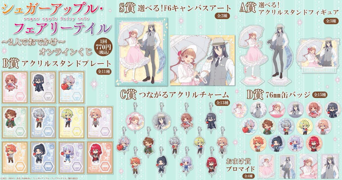 <シュガーアップル・フェアリーテイル ~2人でおでかけ~ オンラインくじ 概要> 販売期間:2023年10月3日(火)12:00~2023年10月31日(火)11:59 販売価格:1回 770円(税込)※別途発送手数料が掛かります。 |