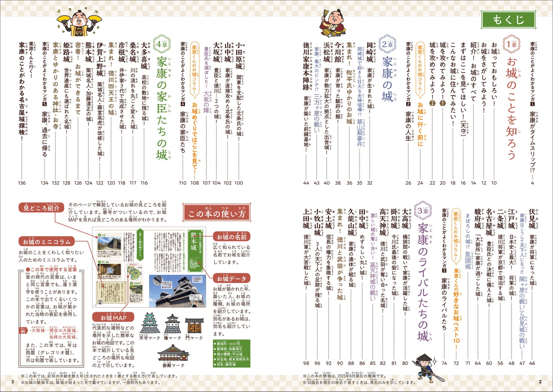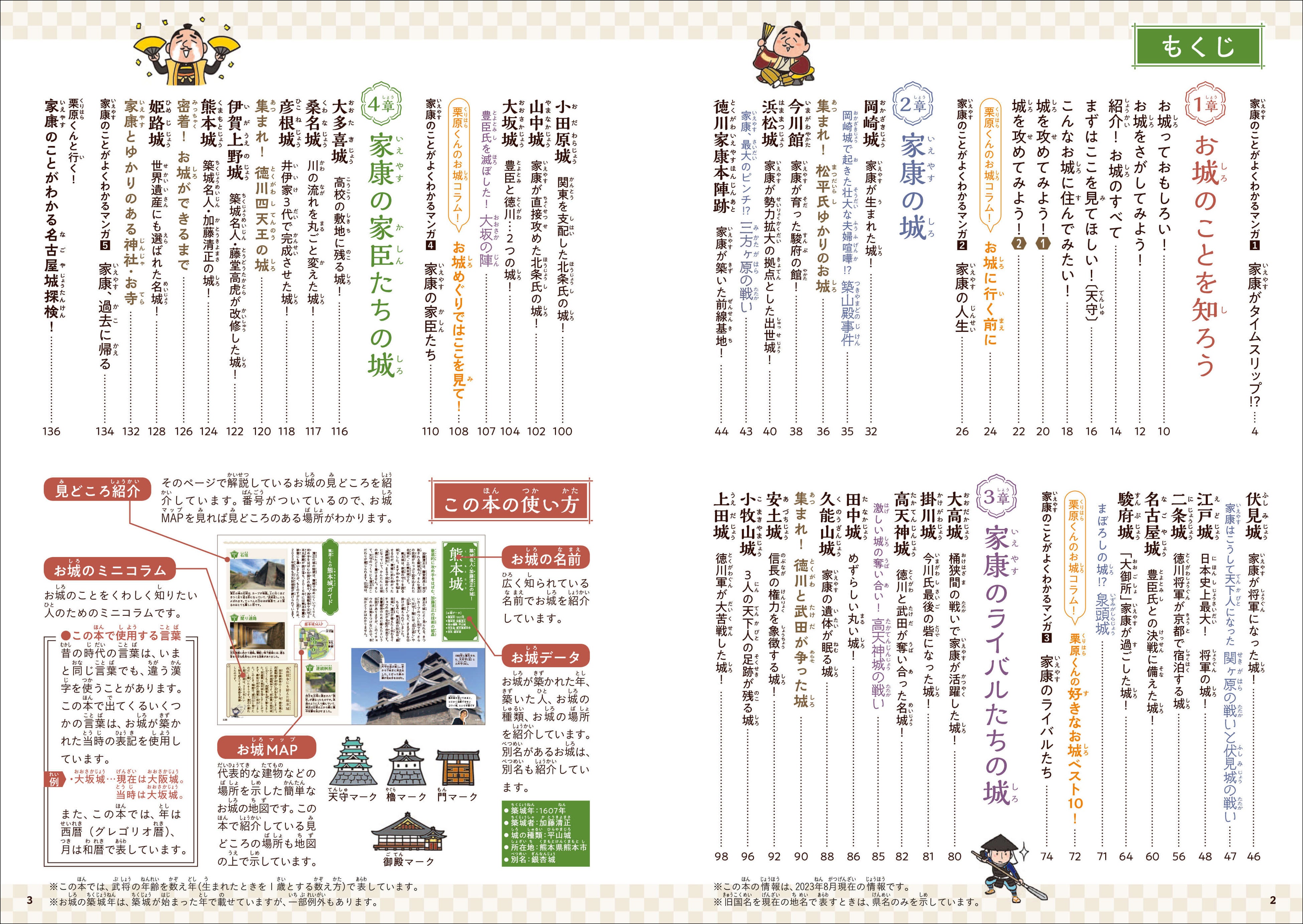 4章立ての構成とし、まずお城に関する基礎知識を解説してから、お城の紹介に入ります。冒頭と巻末、各章の間にはコミックページを挿入し、親しみやすい内容に。お城の魅力を掘り下げるためのミニコラムもはさみながら、お城紹介ページでは、写真とイラストでビジュアルを見せながら紹介していきます。
