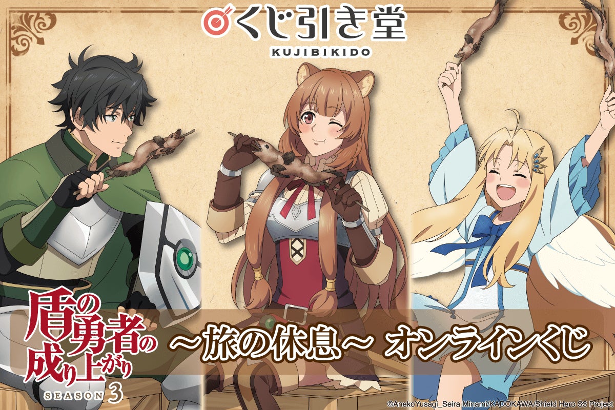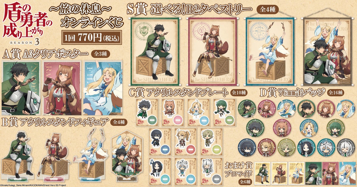 <盾の勇者の成り上がり Season 3 ~旅の休息~ オンラインくじ 概要> 販売期間:2023年11月7日(火)12:00~2023年12月5日(火)11:59 販売価格:1回 770円(税込)※別途発送手数料が掛かります。 |