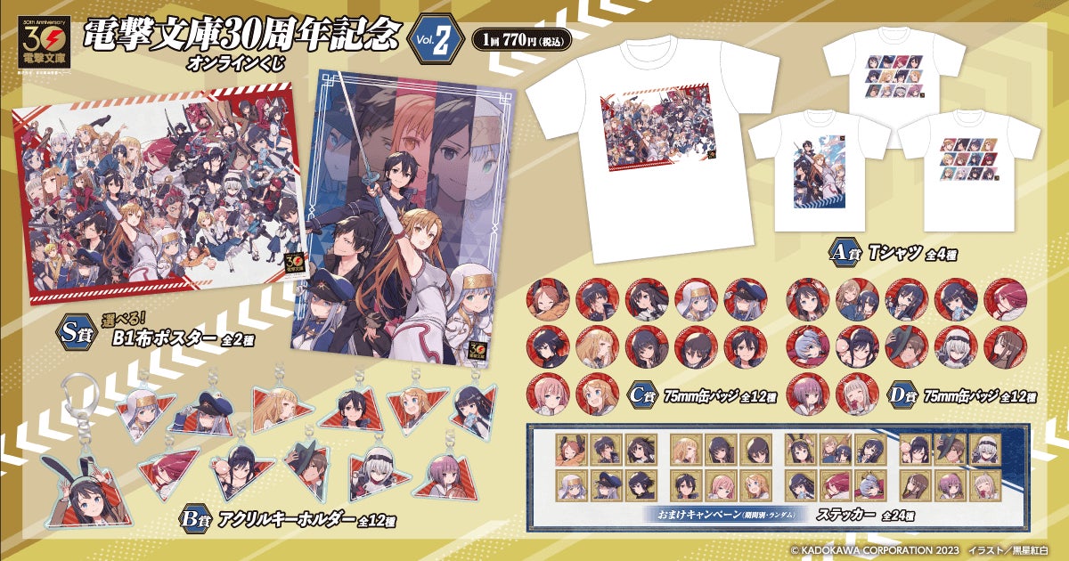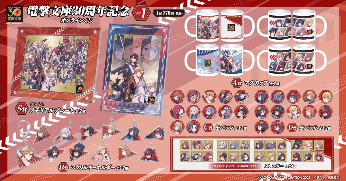 <電撃文庫30周年記念オンラインくじ Vol.1・Vol.2 概要> 販売期間:2023年11月14日(火)17:00~2023年12月12日(火)16:59 販売価格:1回 770円(税込)※別途発送手数料が掛かります。 |