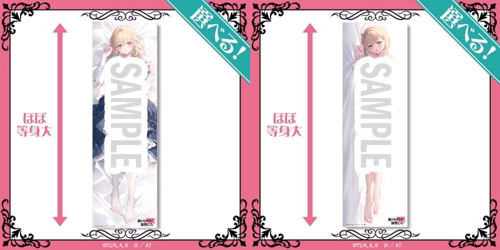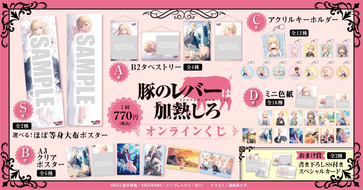 商品は、原作イラストレーター・遠坂あさぎ先生の描き下ろしイラストを含む、貴重なイラストを使用したオリジナルグッズとなります。ほぼ等身大布ポスターやB2タペストリーなど、ファン必携のアイテムをご用意しました(S賞の絵柄を使用した抱き枕カバーは、カドカワストアほかで同時期に受注予定)。