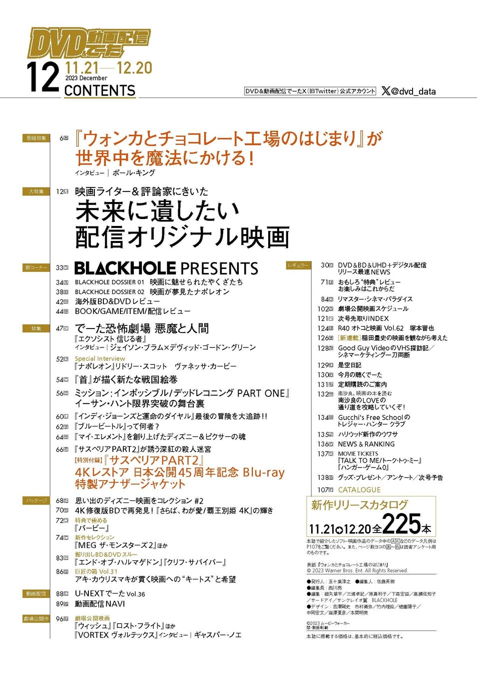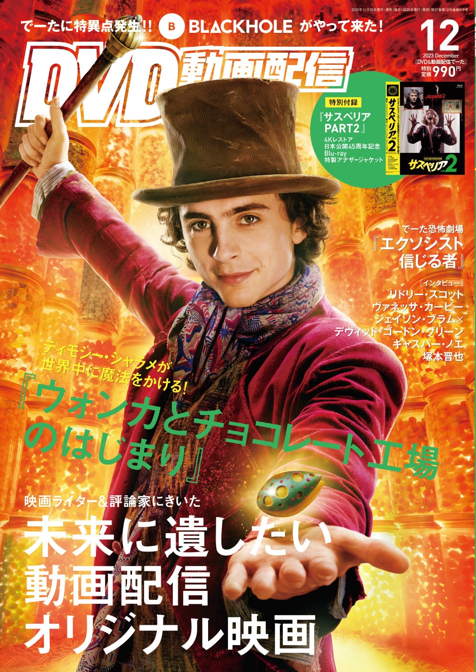 「『ウォンカとチョコレート工場のはじまり』が世界中を魔法にかける!」特集では、監督・脚本を務めたポール・キングのインタビューを掲載! 「映画ライター&評論家にきいた 未来に遺したい配信オリジナル映画」特集では、目の肥えた識者が手元に置いておきたいくらい大切な映画をご紹介します。今月号は特別付録として、『サスペリア2』の4Kレストア日本公開45周年記念Blu-ray特製アナザージャケットがついてくる! 12月号も見逃せない注目コンテンツ盛りだくさんでお届けします。