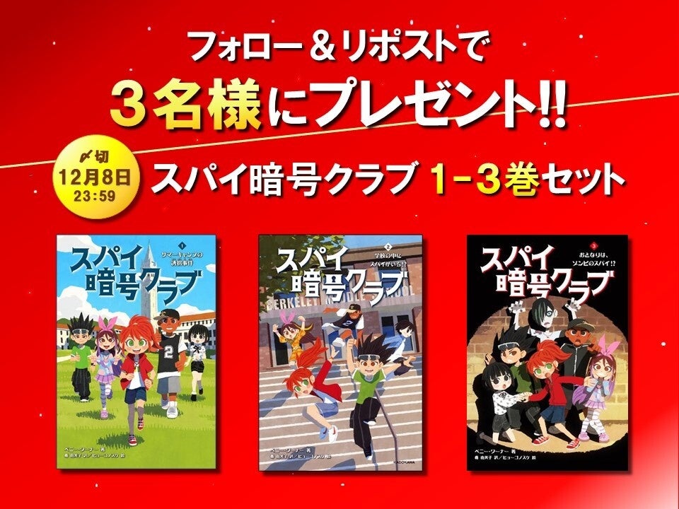 『スパイ暗号クラブ3』発売記念プレゼントキャンペーン【2023秋】 <賞品> 『スパイ暗号クラブ』1-3巻セットを抽選で3名様に <応募しめ切り> 2023年12月8日(金) 23:59 リポスト分まで <応募方法> 注意事項を確認のうえ、 1 X(Twitter)のKADOKAWA翻訳チーム公式アカウント「@kadokawahonyaku」をフォロー 2 キャンペーンの告知投稿をリポスト(RT)で完了! <当選発表> 当選者へのみ、2023年12月11日頃、X(Twitter)のDM(ダイレクトメッセージ)にて「@kadokawahonyaku」よりお知らせします。 ※あらかじめDMを受け取れるよう設定してください。 ※当選の場合、2023年12月18日(月)までに賞品送付先を専用フォームにてご登録いただく必要があります。かならず期日までにDMをご確認ください。 ▼注意事項 ※あらかじめご了承のうえご応募ください。 ◆応募には、X (Twitter)への登録(無料)が必要です。 ◆当選はおひとりにつき1口までとなります。 ◆以下の場合は、応募をお受けできません。 ・非公開アカウントの場合 ・懸賞応募用アカウントやボット(bot)アカウントから応募した場合 ・当選発表以前に、応募投稿を削除した場合 ・当選発表以前に、公式アカウントのフォローを解除した場合 ・第三者の権利を侵害する内容および公序良俗に反する内容など、株式会社KADOKAWA(以下、弊社といいます)で不適切と判断した内容が含まれる場合 ◆応募に際し発生する通信料などは、お客様のご負担となります。 ◆賞品の発送は2024年1月中旬を予定しています。なお、発送先は日本国内に限ります。 ◆当選賞品を譲渡(転売、オークション出品含む)しないことが応募・当選の条件です。譲渡が明らかになった場合、当選は取り消され賞品をお返しいただくことがあります。 ◆当キャンペーンは、弊社が主催しています。X(Twitter)およびX Corp.とは関係ありません。 ◆X(Twitter)および関連ツールの動作等の不測の障害により、当キャンペーンを予告なく変更・中止させていただく場合があります。 ◆応募に際しご提供いただいた個人情報は、弊社のプライバシーポリシー(https://ir.kadokawa.co.jp/company/privacy_policy.php)の定めるところにより取り扱わせていただきます。 ◆応募に際しお客様に生じた損害等につきましては、弊社に重過失のある場合を除き、弊社は一切賠償の責を負わないものとします。 <お問い合わせ> KADOKAWA カスタマーサポート https://wwws.kadokawa.co.jp/support/contact/ ※「スパイ暗号クラブ3発売キャンペーンについて」とご明記ください。 ※サポートは日本国内に限ります。