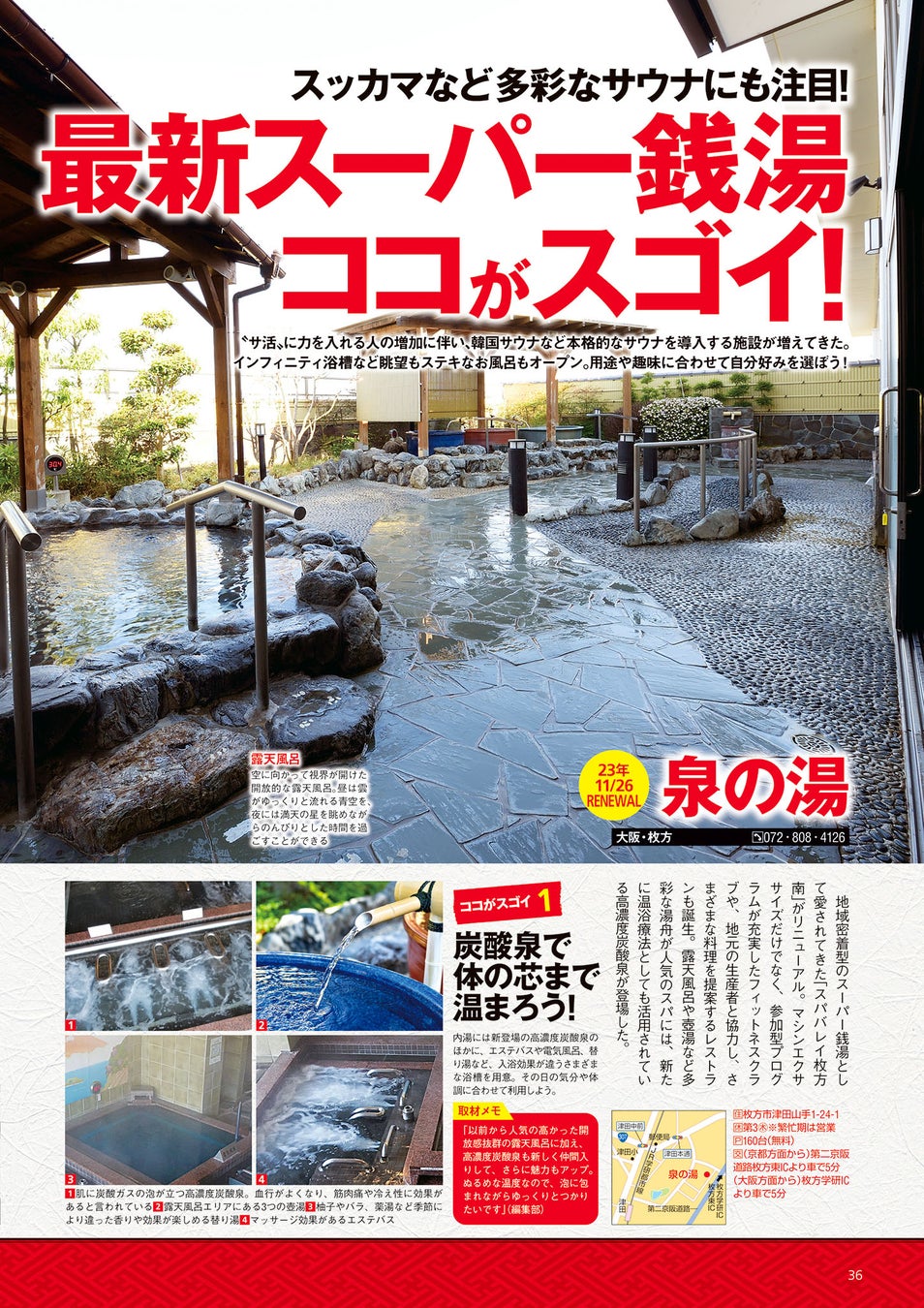 関西の人気スーパー銭湯をお得に楽しめる、入浴無料&半額などのうれしい特典が満載。疲れた体をリフレッシュする、施設の活用術も必見!ほか、施設がどこにあるか一目でわかる「サウナ&スーパー銭湯&日帰り温泉MAP」など、企画盛りだくさんでお届けします!