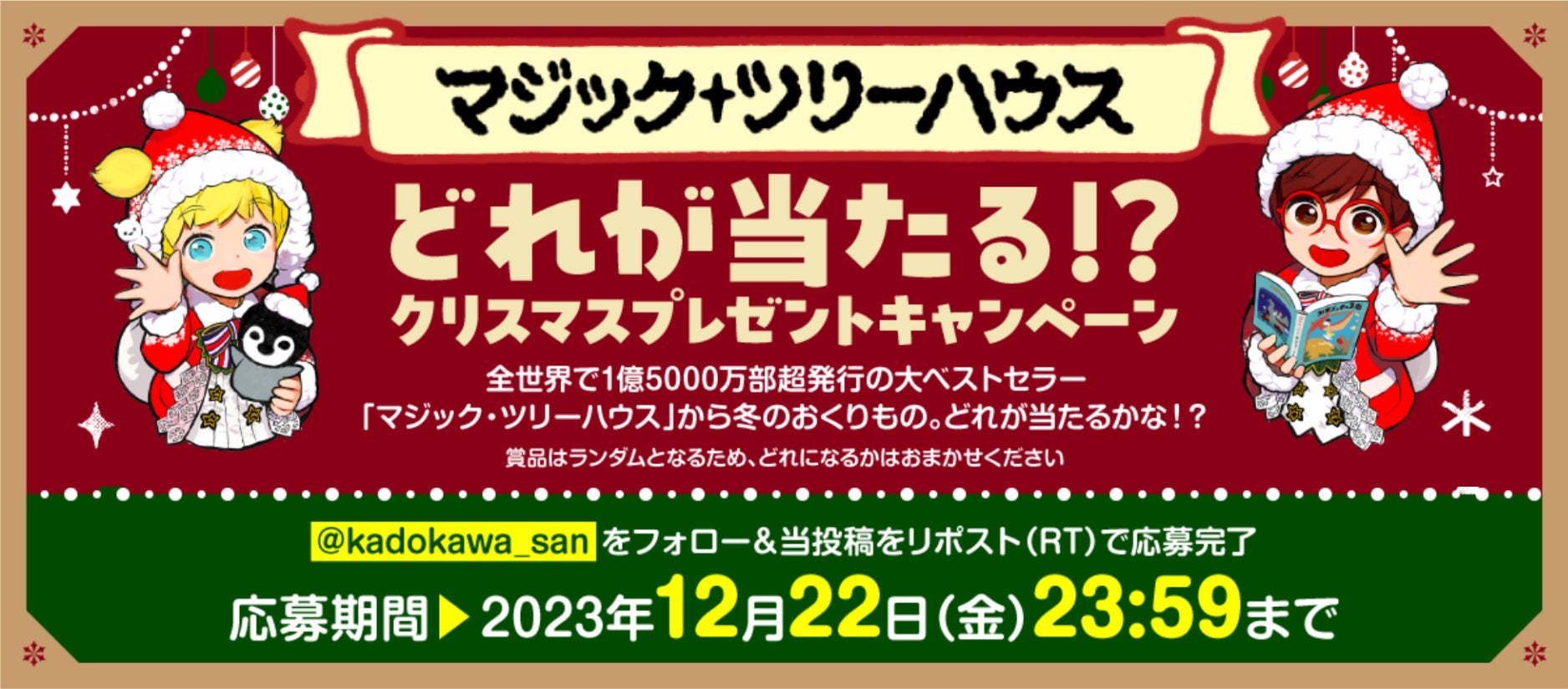 株式会社KADOKAWA(本社:東京都千代田区、代表取締役社長:夏野 剛 以下KADOKAWA)は、大人気児童書シリーズ「マジック・ツリーハウス」にて読者の皆様への感謝を込めて「どれが当たる!?クリスマスプレゼントキャンペーン」を本日2023年12月11日(月)より実施いたします。