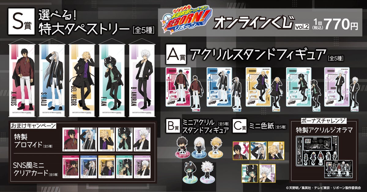 <家庭教師ヒットマンREBORN! オンラインくじ Vol.2 概要> 販売期間:2023年12月19日(火)12:00~2024年1月9日(火)11:59 販売価格:1回 770円(税込)※別途発送手数料が掛かります。 購入ページ:https://kujibikido.com/lp/reborn-3_2/ 期間中に“リポスト(RT)キャンペーン”として、くじ引き堂のX(旧Twitter)公式アカウントをフォロー&リポスト(RT)すると、抽選で3名様に「A賞 アクリルスタンドフィギュア全5種セット」をプレゼント。 |