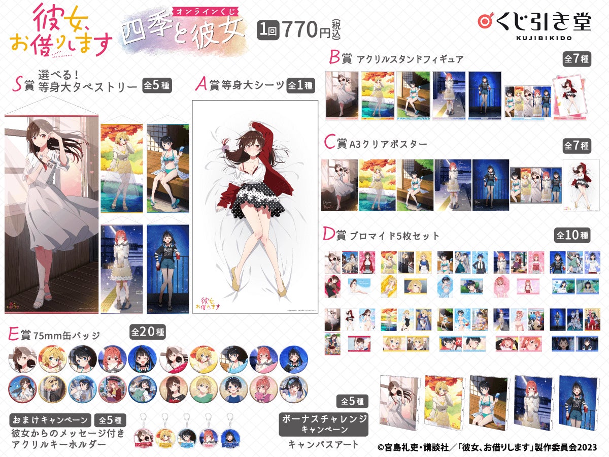 <彼女、お借りします オンラインくじ 四季と彼女 概要> 販売期間:2023年12月19日(火)12:00~2024年1月9日(火)11:59 販売価格:1回 770円(税込)※別途発送手数料が掛かります。 |