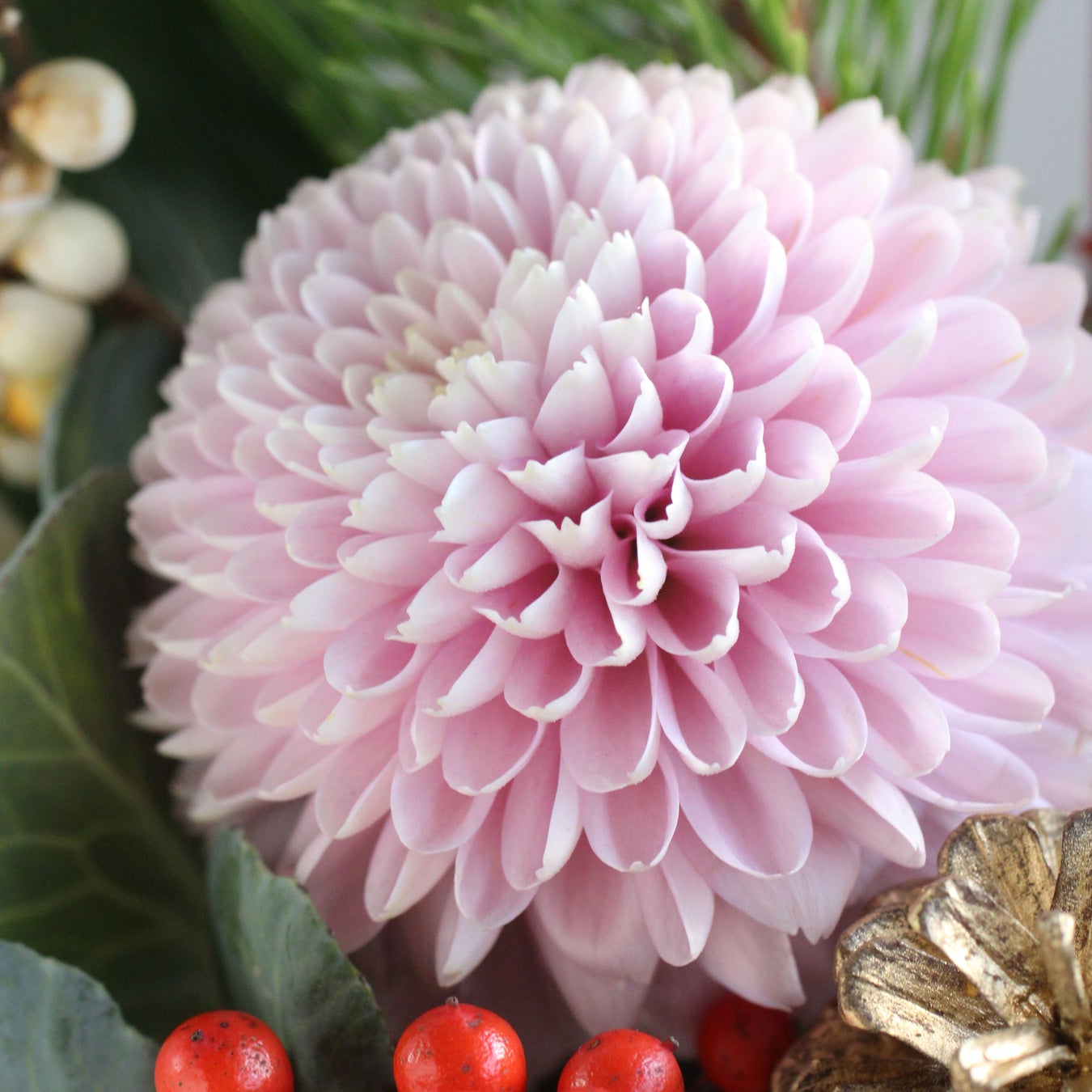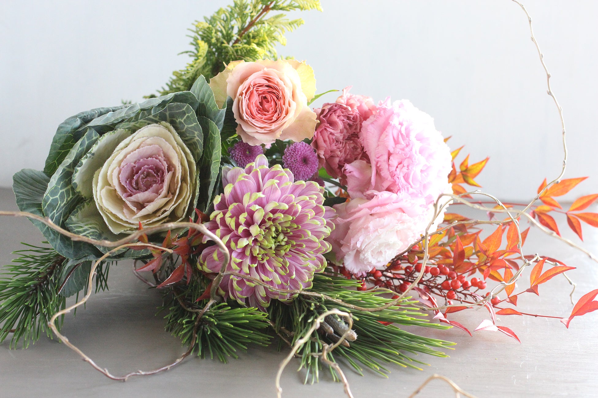 ピンクの丸い菊や葉牡丹が愛らしさを添える「新春アレンジ」です。