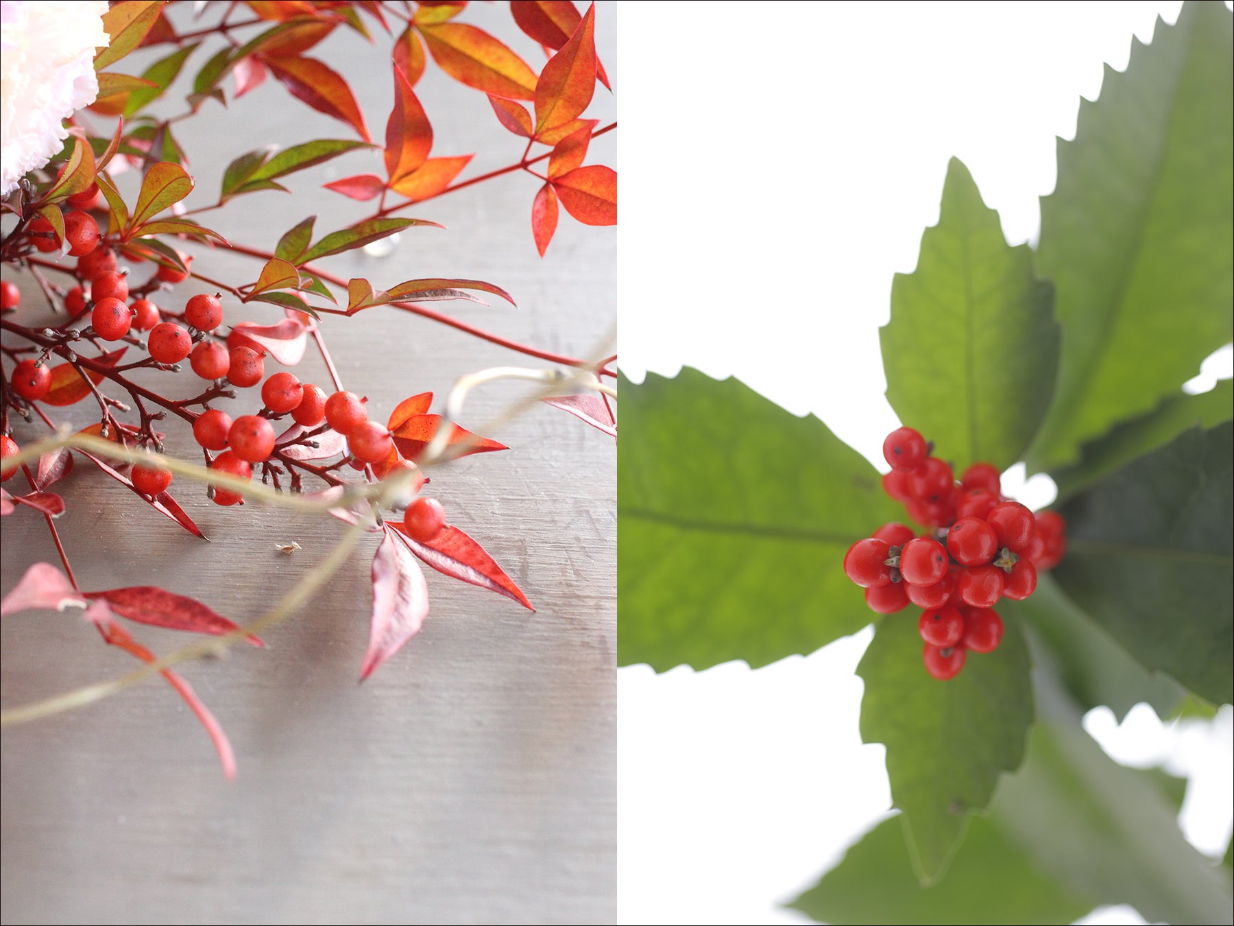 赤い実は、南天(写真左)もしくは千両(右)が入ります。