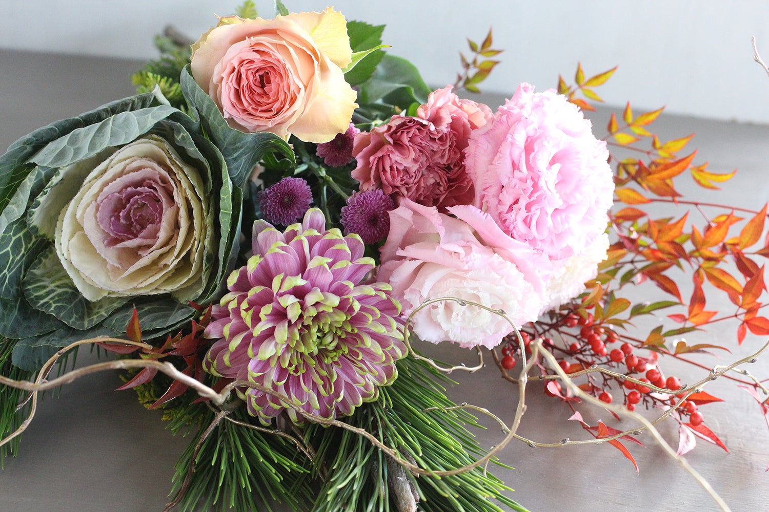 新年から、幸せな気分になれるように、キクはもちろん、バラやトルコギキョウなどの華やかなピンクの花々が主役です。