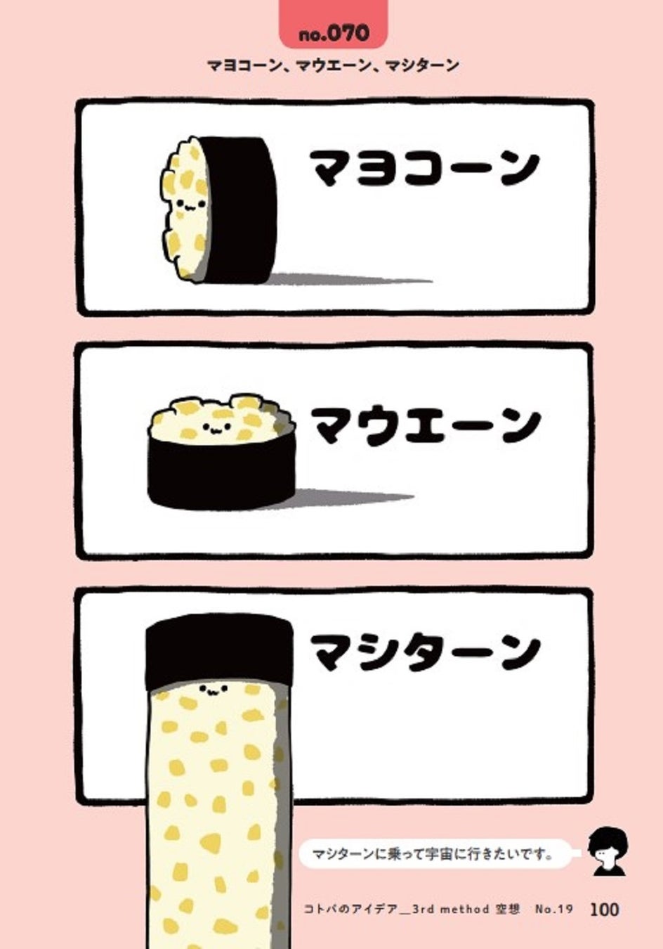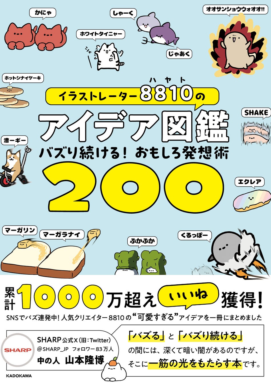 マーガリン、マーガラナイ」「漕ーギー」など、可愛すぎる面白アイデアをSNSで日々発信し、累計いいね数は1000万越え。日々バズを生み出すイラストレーター8810(Hayato)の作品が新作を交えて1冊に。掲載アイデア総数は200点!バズを生む作品を作り出すアイデア発想法についても論理的に詳しく紹介し、日常やビジネスでも生かせる考え方のヒントを提供する一冊です。