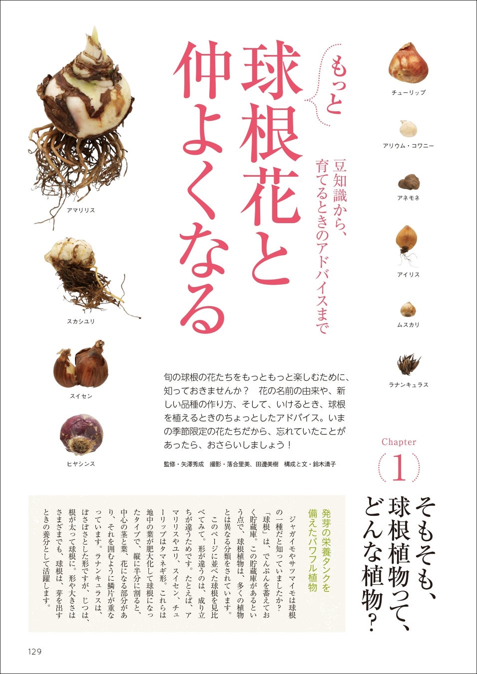 そして、「そもそも球根花ってなんだろう」という素朴な疑問から、花の仕組みや新しい品種の作り方、扱い方のコツといった、球根花と仲よくなるために知っておきたいことも丁寧に紹介しています。ぜひ、役立ててください。