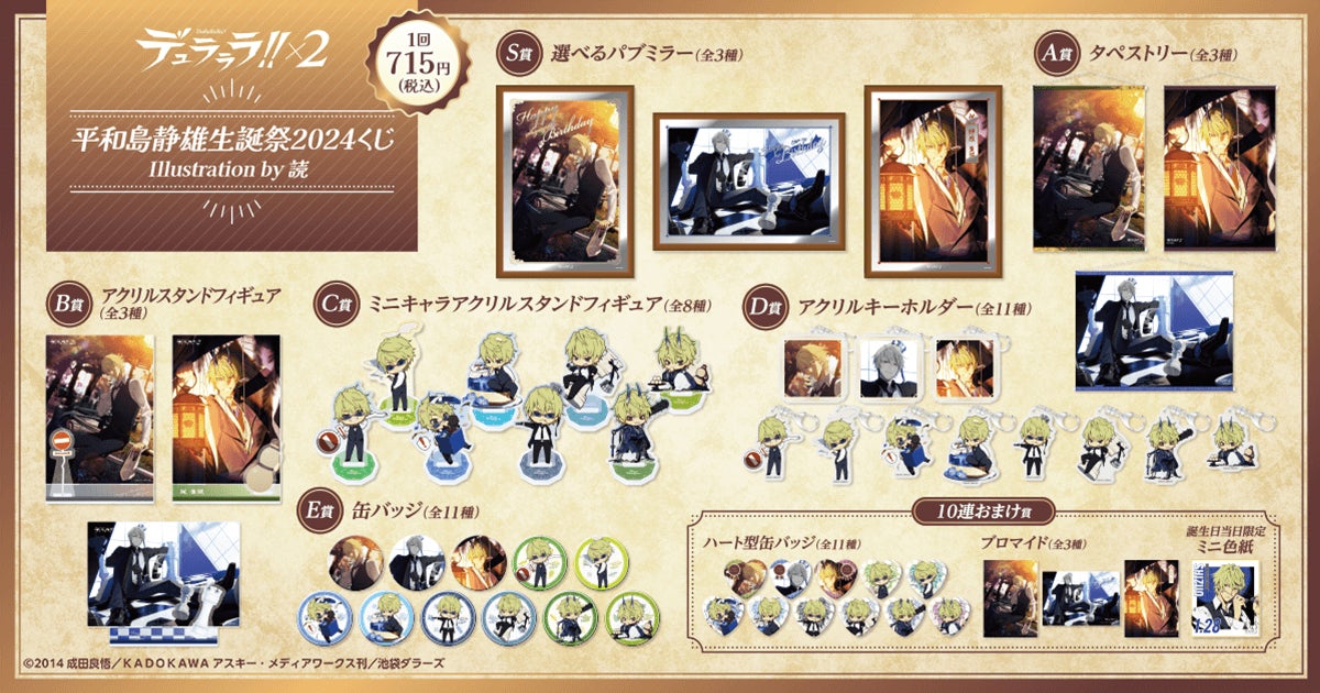 <デュラララ!!×2 平和島静雄生誕祭2024くじ Illustration by 読 概要> 販売期間:2024年1月23日(火)12:00~2024年2月20日(火)11:59 販売価格:1回 715円(税込)※別途発送手数料が掛かります。 |
