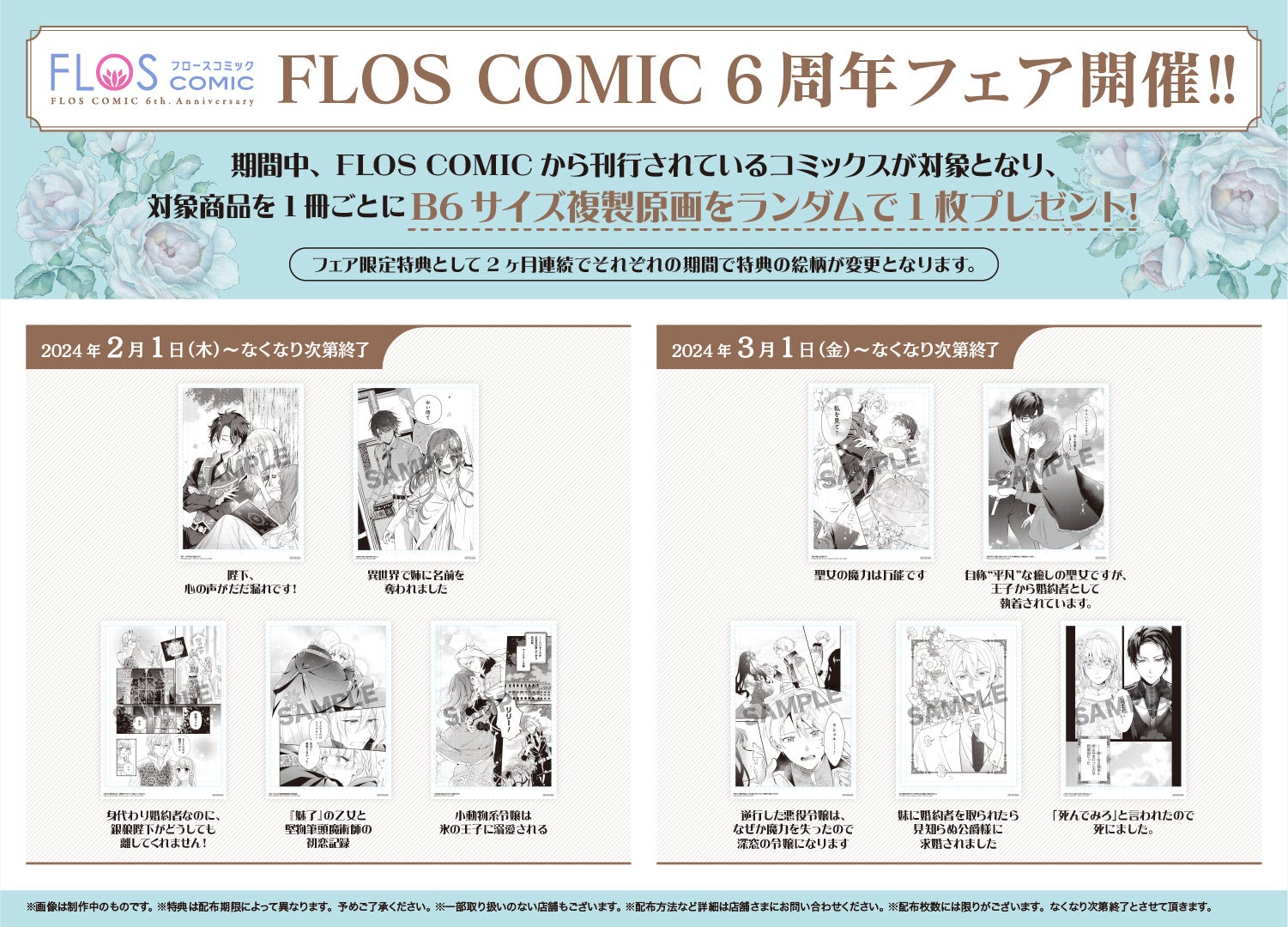 株式会社KADOKAWA(本社:東京都千代田区、取締役 代表執行役社長 CEO:夏野剛)は、2024年2月1日(木)から女子向け異世界コミック「FLOS COMIC(フロースコミック)」の創刊6周年を記念して、FLOS COMIC作品を書店で購入するとミニ複製原画がもらえるキャンペーンや、書店購入後にアプリで応募した方の中から抽選で直筆サイン色紙・サイン入りB4複製原画が当たるプレゼントキャンペーンを実施いたします。
