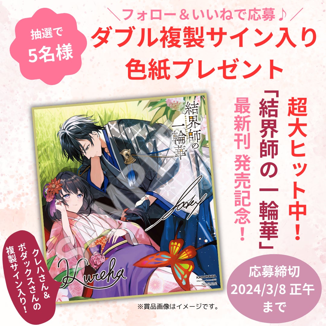 株式会社KADOKAWA(本社:東京都千代田区、取締役 代表執行役社長 CEO:夏野剛)は、本日2月22日、シリーズ累計100万部突破の大人気和風ラブファンタジー『結界師の一輪華』(著/クレハ 角川文庫刊)の最新4巻を発売。これを記念して、抽選で5名様に、著者のクレハさんとカバーイラストを担当するボダックスさんのダブル複製サイン入り色紙が当たるInstagramプレゼントキャンペーンを実施します。
