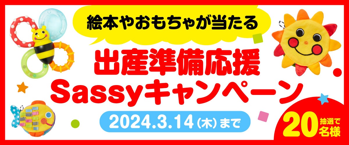 0歳の誕生日から楽しめる「Sassyのえほん」シリーズから、妊婦さんへの応援の気持ちをこめて、Sassyの絵本やおもちゃが当たるプレゼントキャンペーンを実施します。
